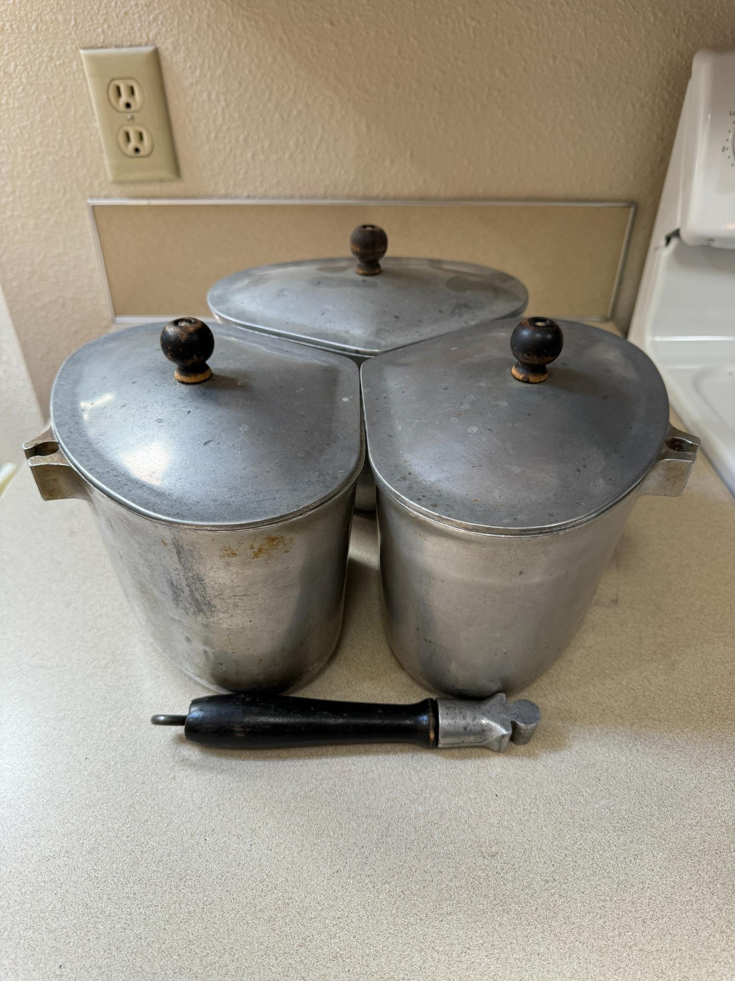 Mid Century Club Aluminum Triangle Cookware w/Handle Used, good condition Wood handle and knobs
