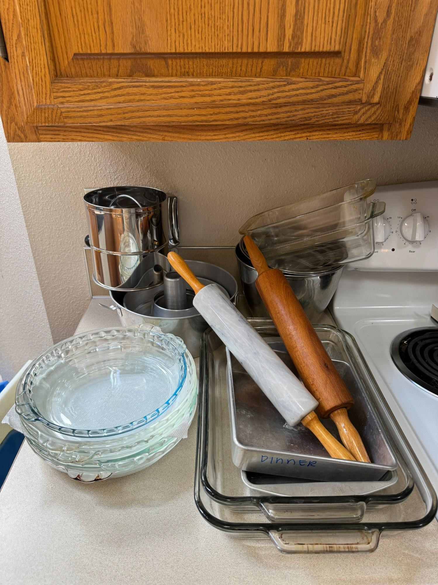 Baking Goods 1 PYREX Pie Plates (one pyrex plate) Rolling Pins Stainless mixing bowls Like new large sifter and more