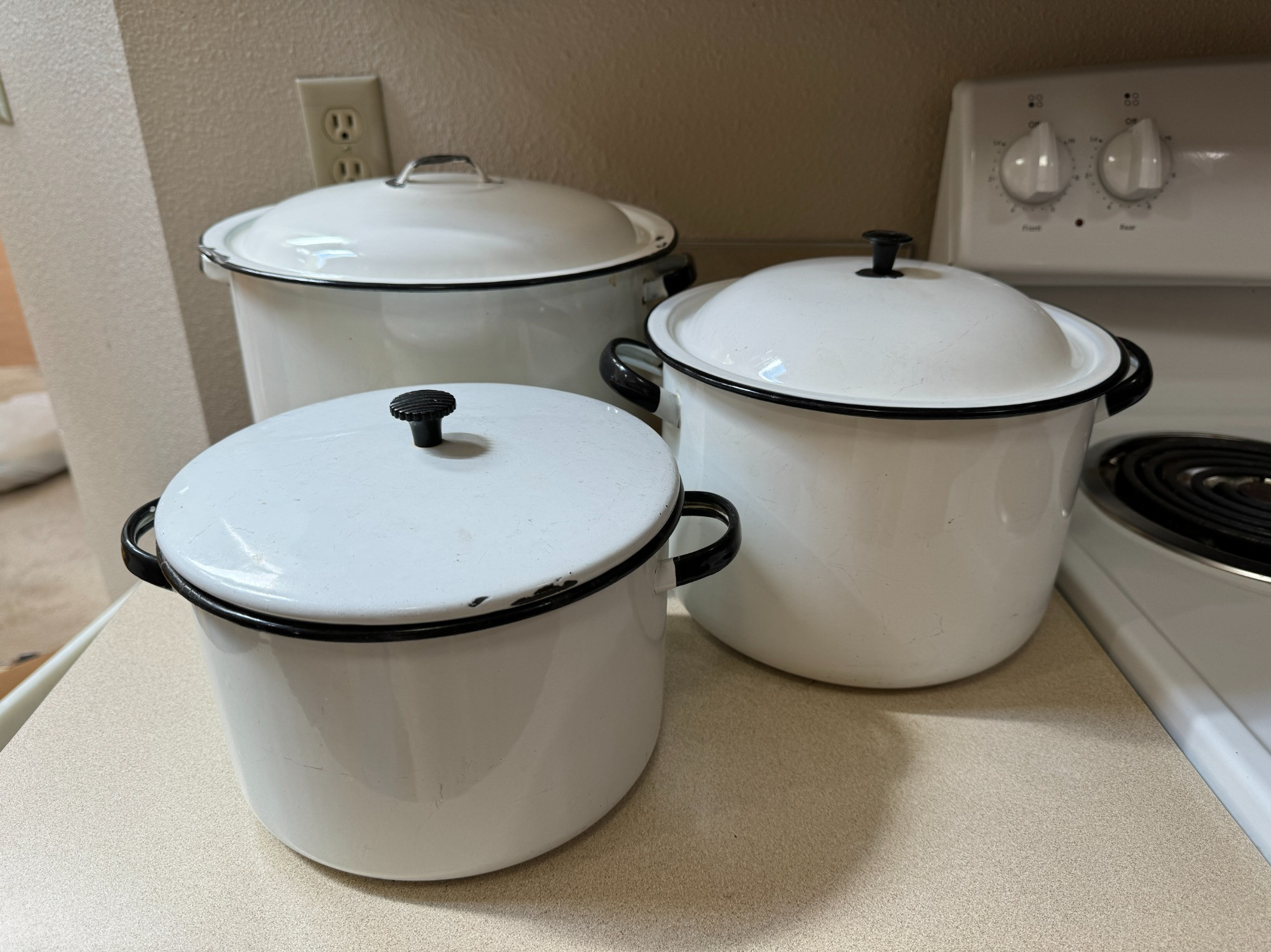 True Vintage White & Black Enamel Stock Pans All have signs of wear according to age Diameters range from 8.25"-11.5" Only largest pot seems to have original lid
