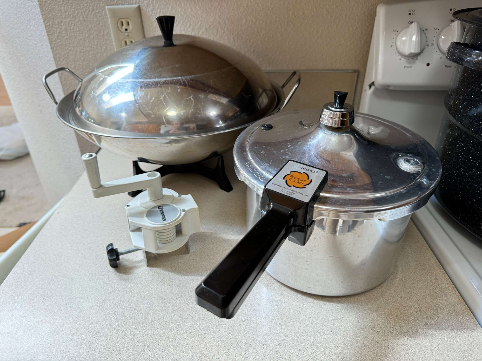 Mid Century Farberware Wok 303 & stovetop Presto Pressure Cooker Vitantonio green bean frencher Wok works!