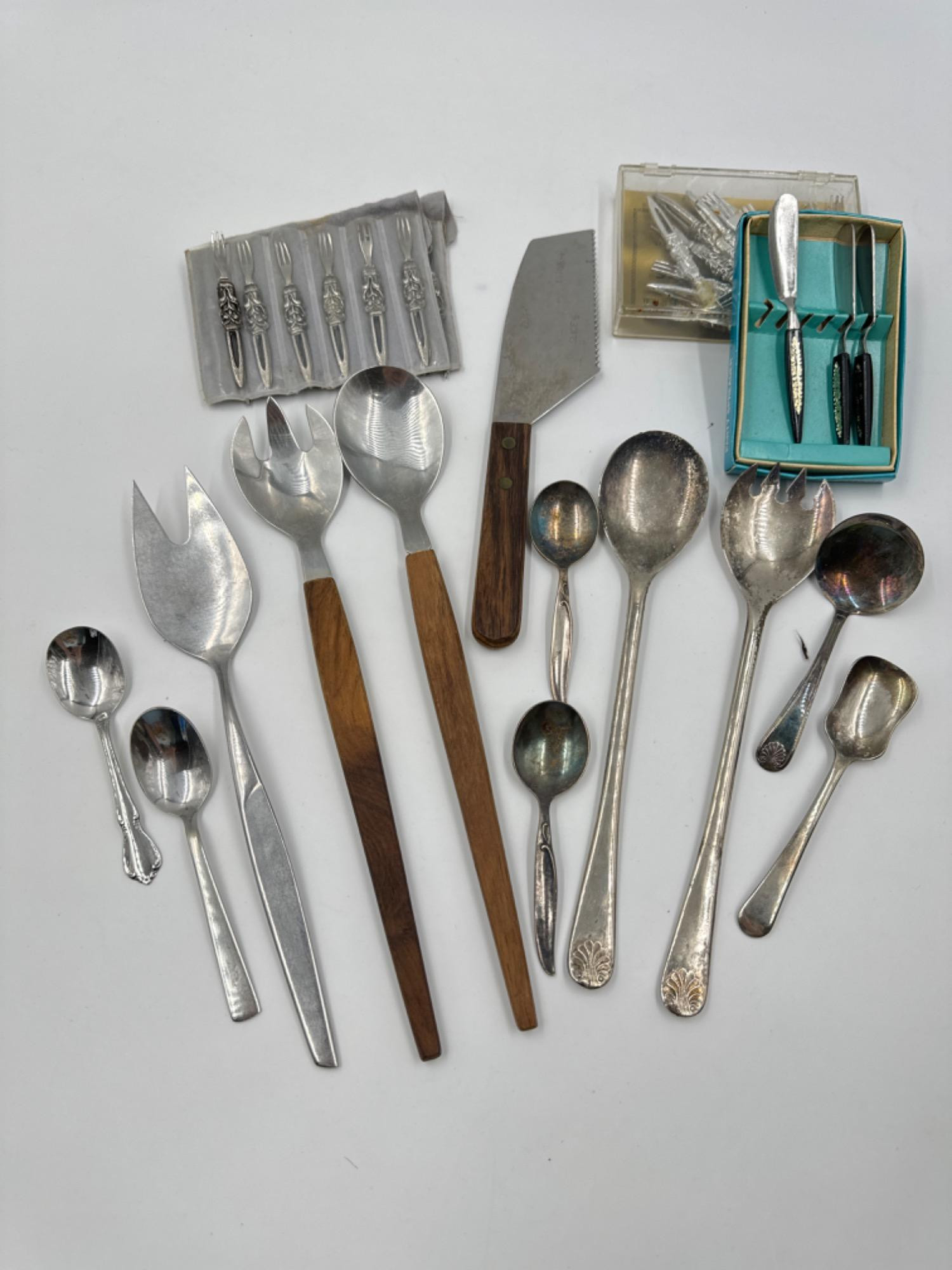 Smallest 3.25 inches Longest 11.25 inches Made in Denmark Teak & Stainless set - needs some repairs to the handles MCM Gustav Sweden Stainless serving fork - surprisingly sharp Silver Plate - Sheffield, WM Rogers & WA Italy Cocktail forks and more