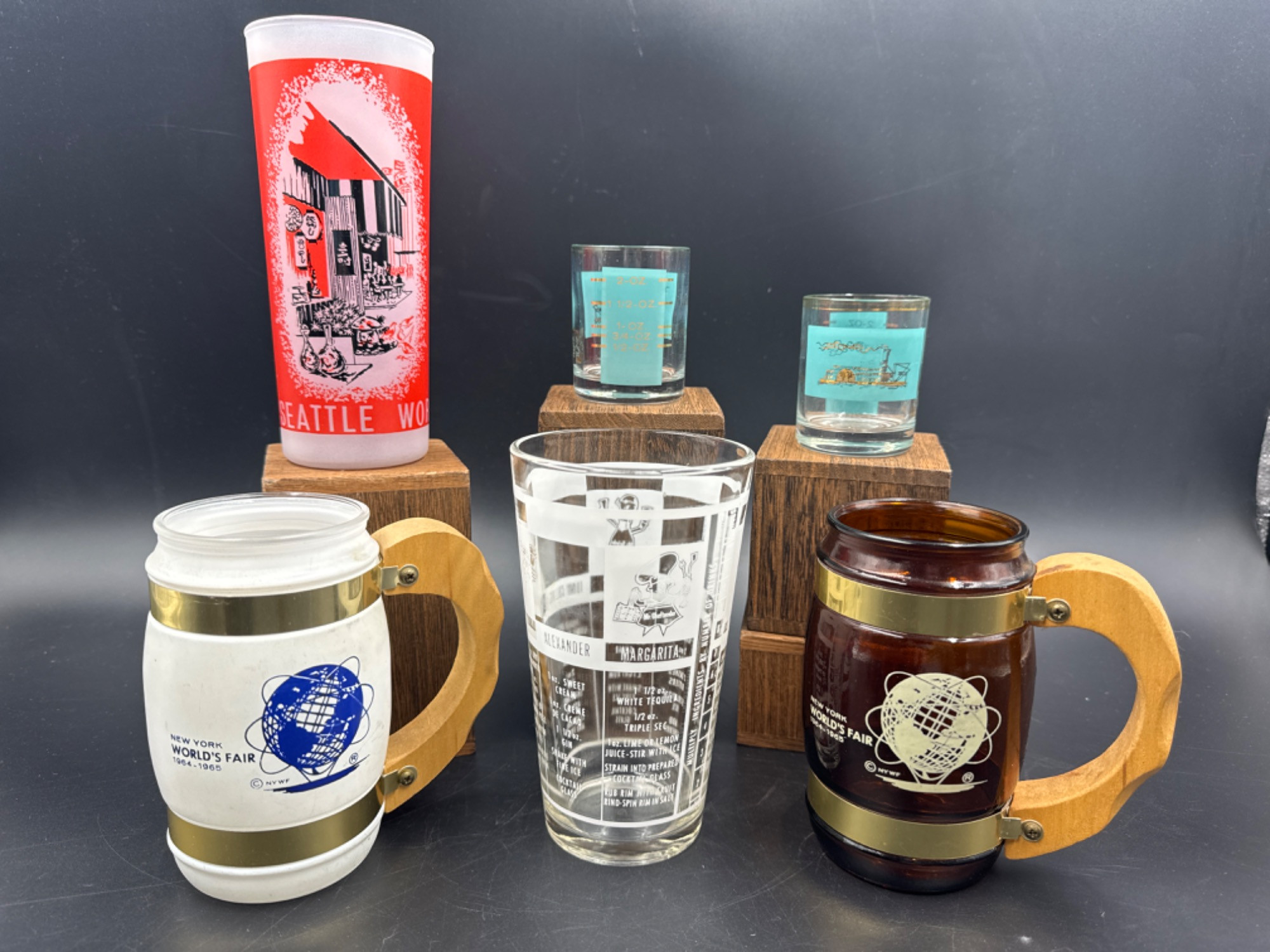 (2) South Carolina Steamboat mid-century jiggers - wear to gold rim Federal glass shaker base (2) 1964 Siesta Wear New York World's Fair 1962 Seattle World's Fair Boulevard of the World - 6.75 inch Tumbler