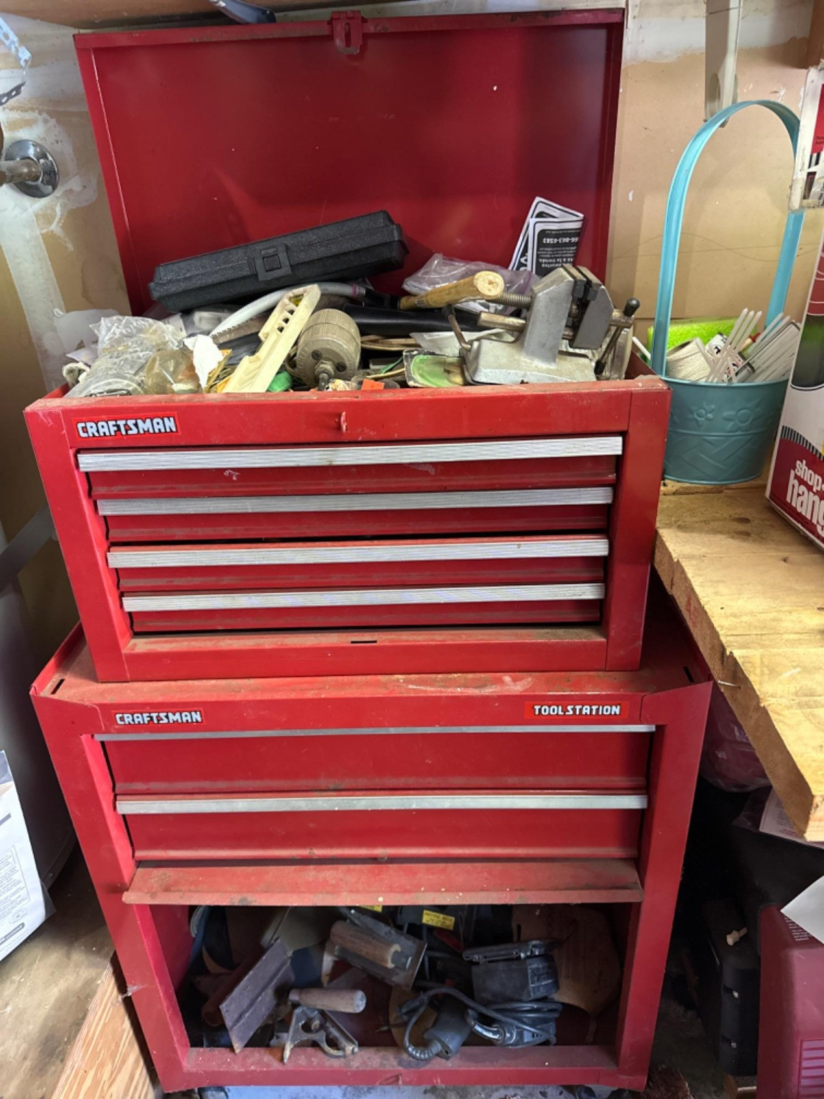 Two Tier Loaded Rolling Craftsman Tool Chest Measures: 42 inches tall 27 inches wide by 14 inches deep Contents included: wrenches, level, scribe tool, vice, square, sander, masonry tools, miter box, hammers, chisels, sharpening stone, staplers, pop rivet tool, measuring tape, punches, pliers, chalk line, and more!