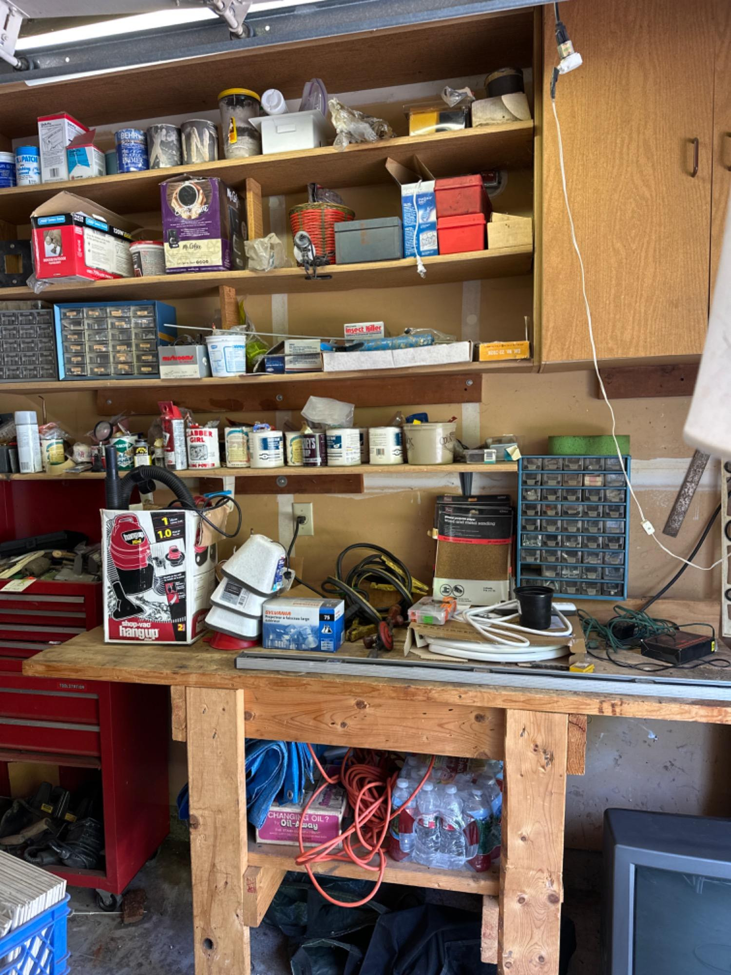 The Workbench, it’s contents, and everything on the shelves Bench is made out of yellow pine 2 x 6. Measures: 72 inches long x 23.5 inches deep x 40 inches tall Some items include: three screw boxes, jumper cables, 4 foot metal level, 24 inch level, two hand saws, caulk gun, coffee maker, soldering equipment, sonicare toothbrush, electrical fittings, 2 clamp lights, 8 packages of sandpaper, power cord, case of water and more! must take all Red craftsman toolbox NOT included - see lot 170
