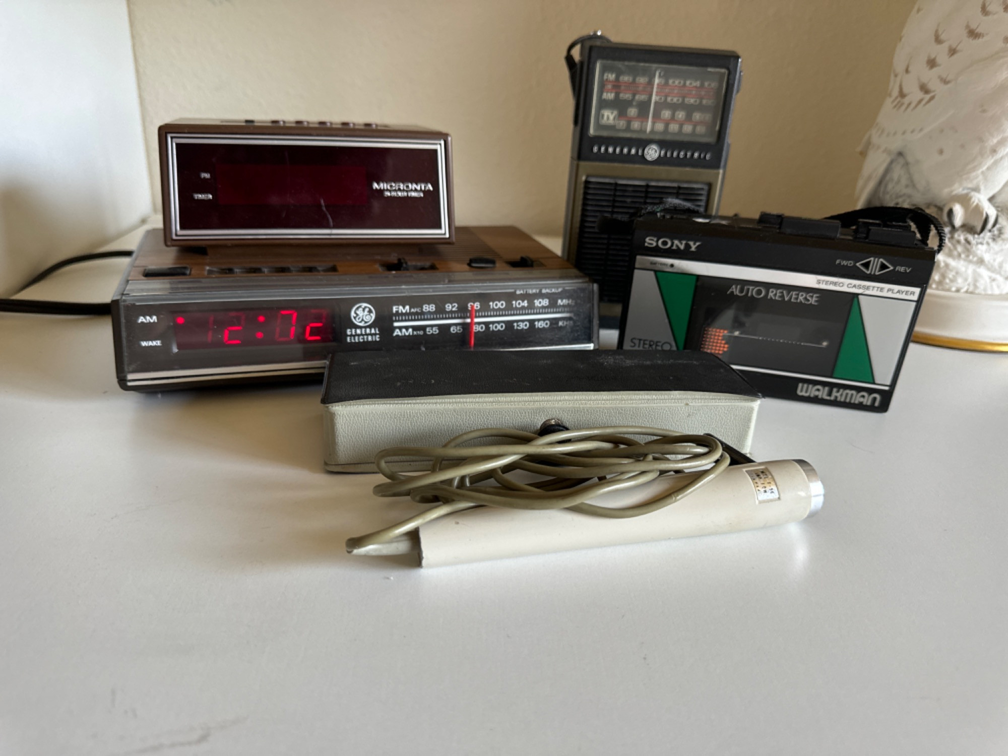 Sony Dynamic Microphone (2) Vintage AM/FM Radio alarm clocks - turn on, show time Sony Walkman - untested - missing battery cover General Electric AM/FM Portable Radio - untested
