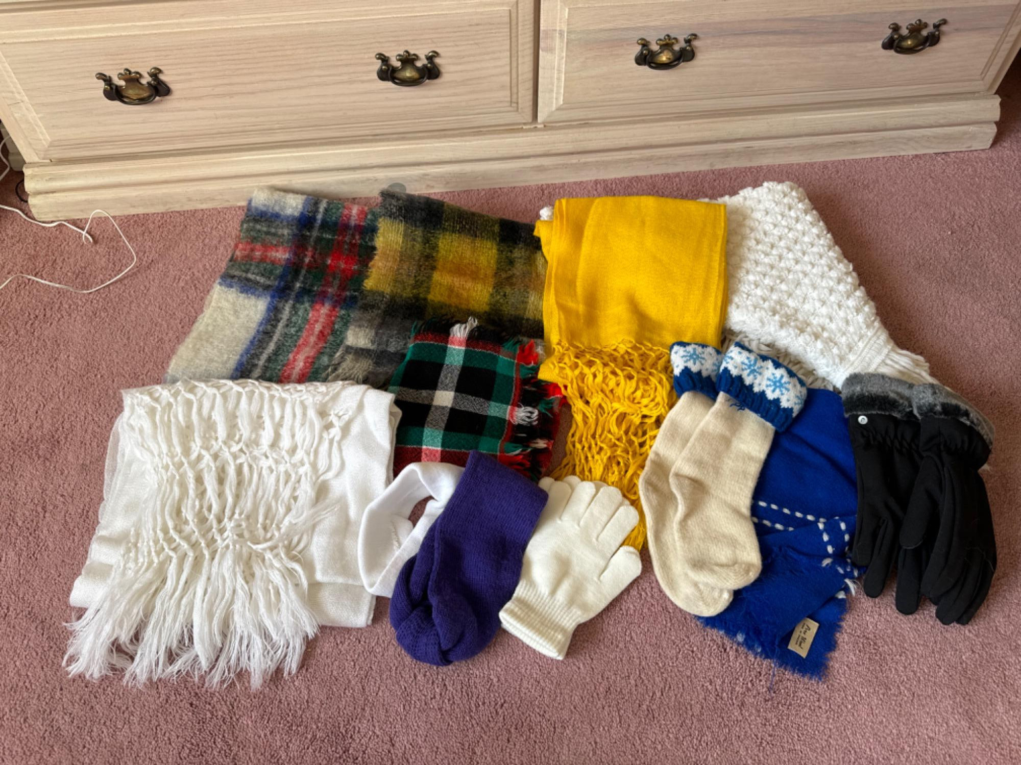 Winter Is Coming.... Ok it isn't coming for a bit, but best be prepared Vintage White Italian made scarf - mostly wool Vintage Bloomingdale's Plaid Scarf - Heather-Brae 2 wool scarves Modern gloves with touch screen capacity and more