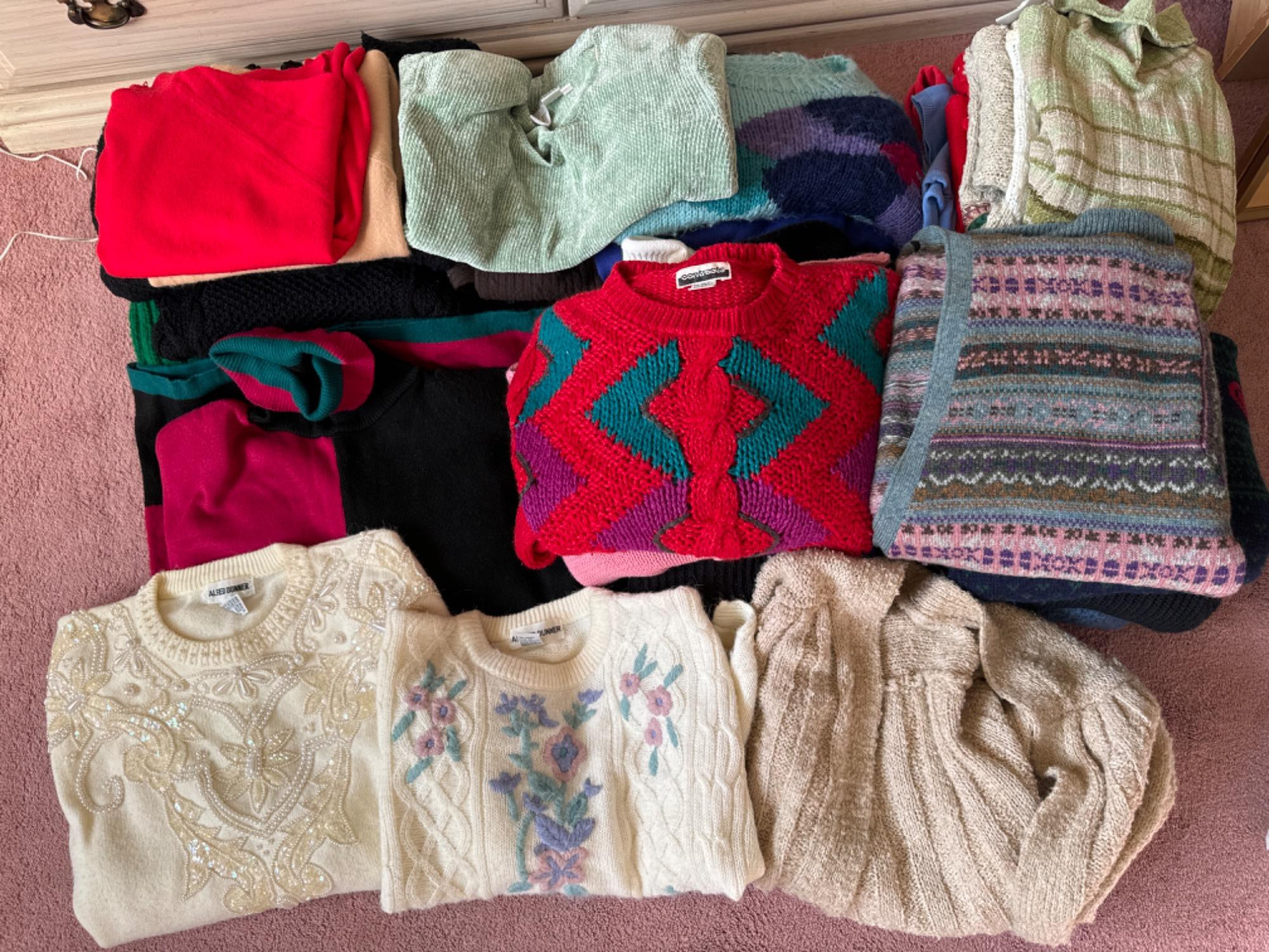Large Collection of Vintage Sweaters - Eddie Bauer Wide range of sizes from M to XL and several one size for all Some of the sweaters were lovingly handcrafted