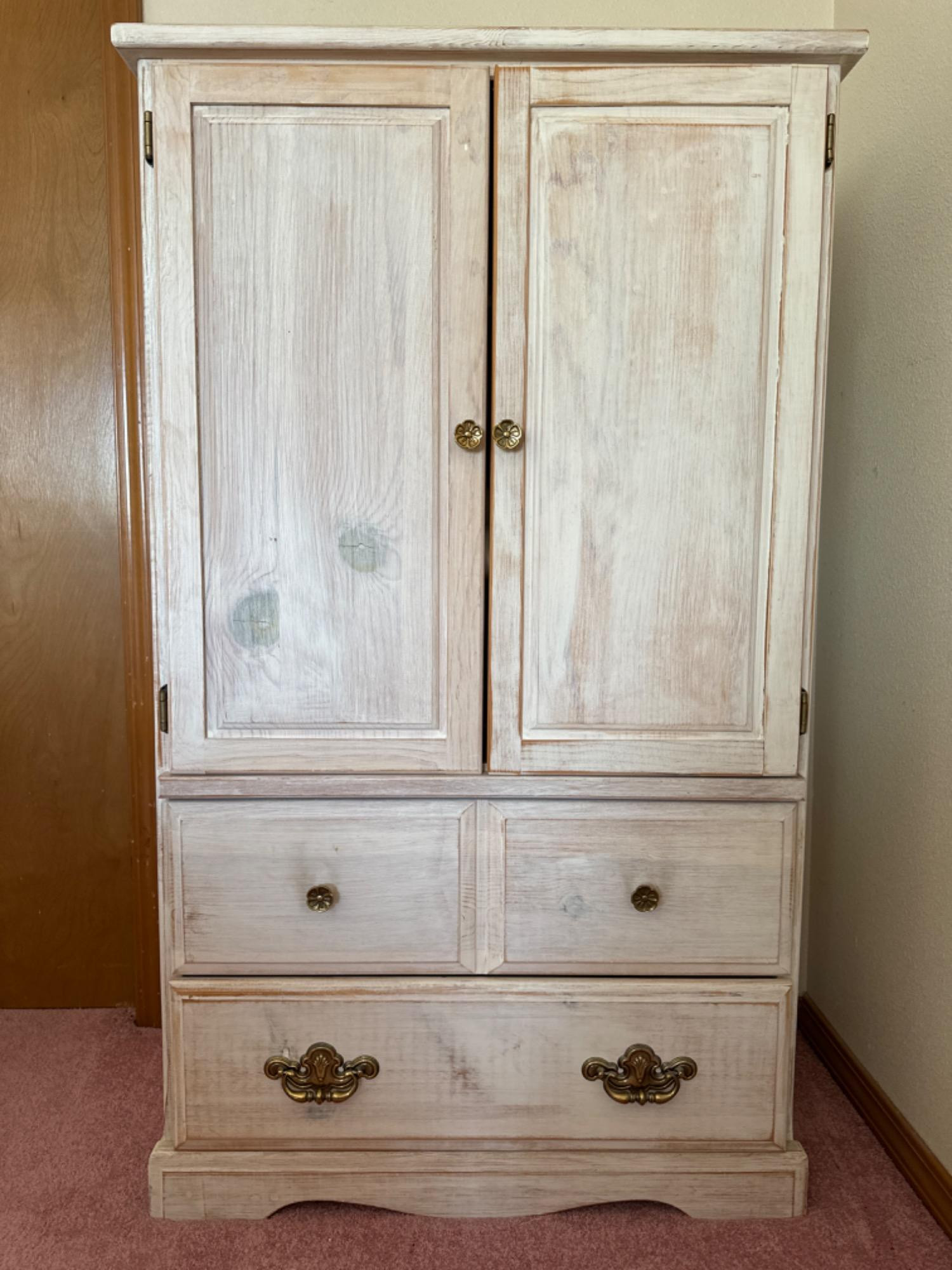 White Washed Solid Wood Small Armoire Good condition. Vintage Hardware Contents NOT included Measures: 30.5 inches wide by 17 inches deep by 52.25 inches tall Bidding on this lot is an agreement that: (1.) You
