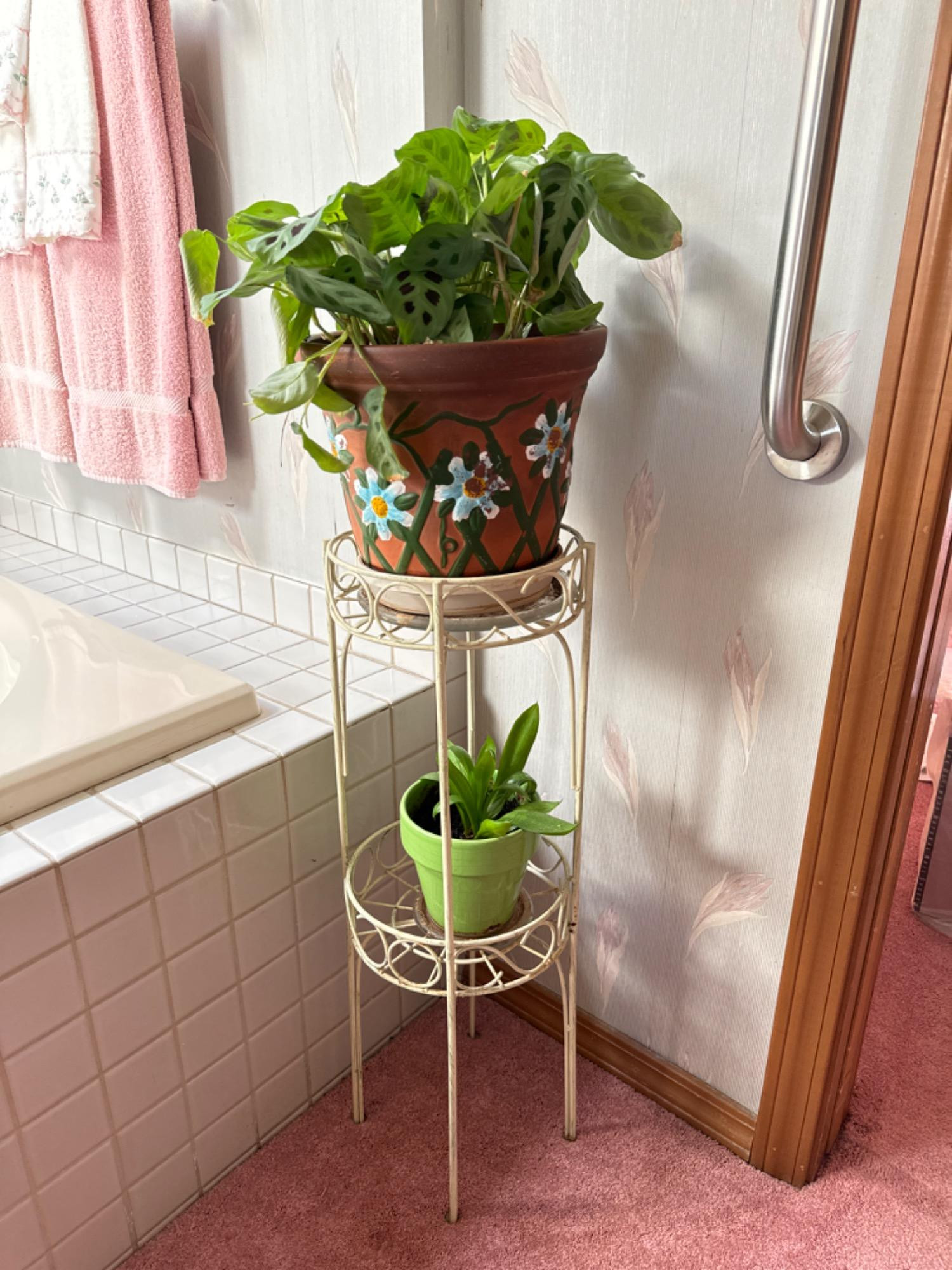 Two-tier Metal plant stand approximately 27 inches tall with the diameter of 10 inches more than likely vintage with a faux patina painted on it. Prayer plant is looking a little dry after photos were taken very resilient 10 inch pot smaller one unsure what it is may have been overwater though looks like a snake plant very wet 5.5 inch diameter.