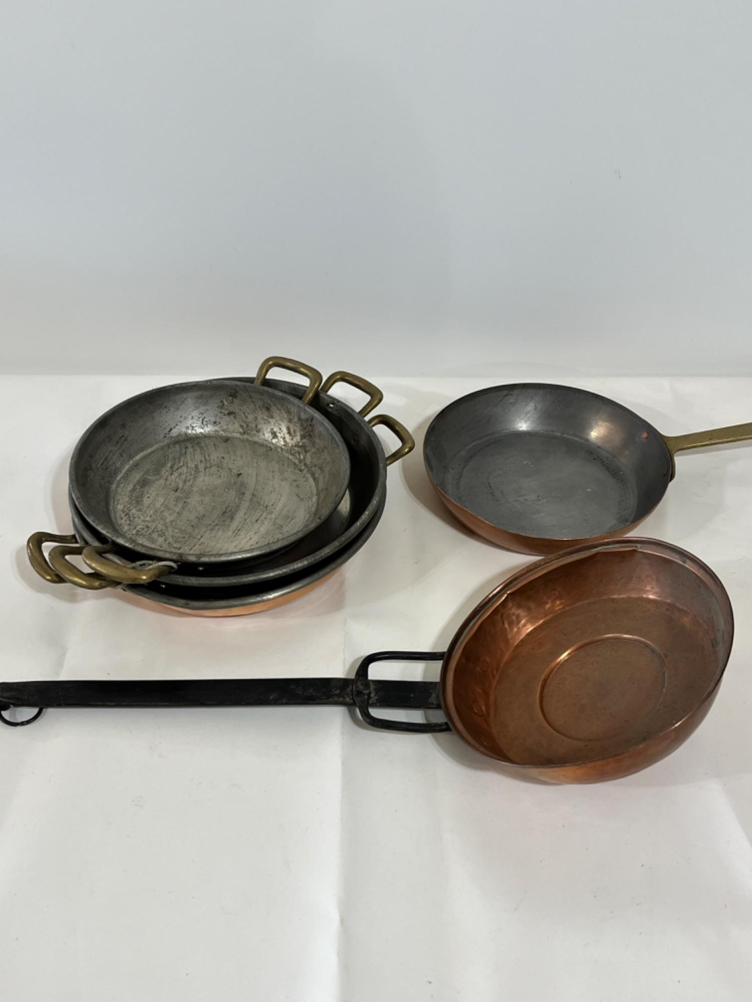 - Antique copper cookware set. - 5 pans total. -Pans diameters: Large handle copper: 7.25", Small handled copper: 7.75", Small & Large joined copper pans: 8.25" & 9.5", Large grip handled copper pan: 9.5" - See photos for details.