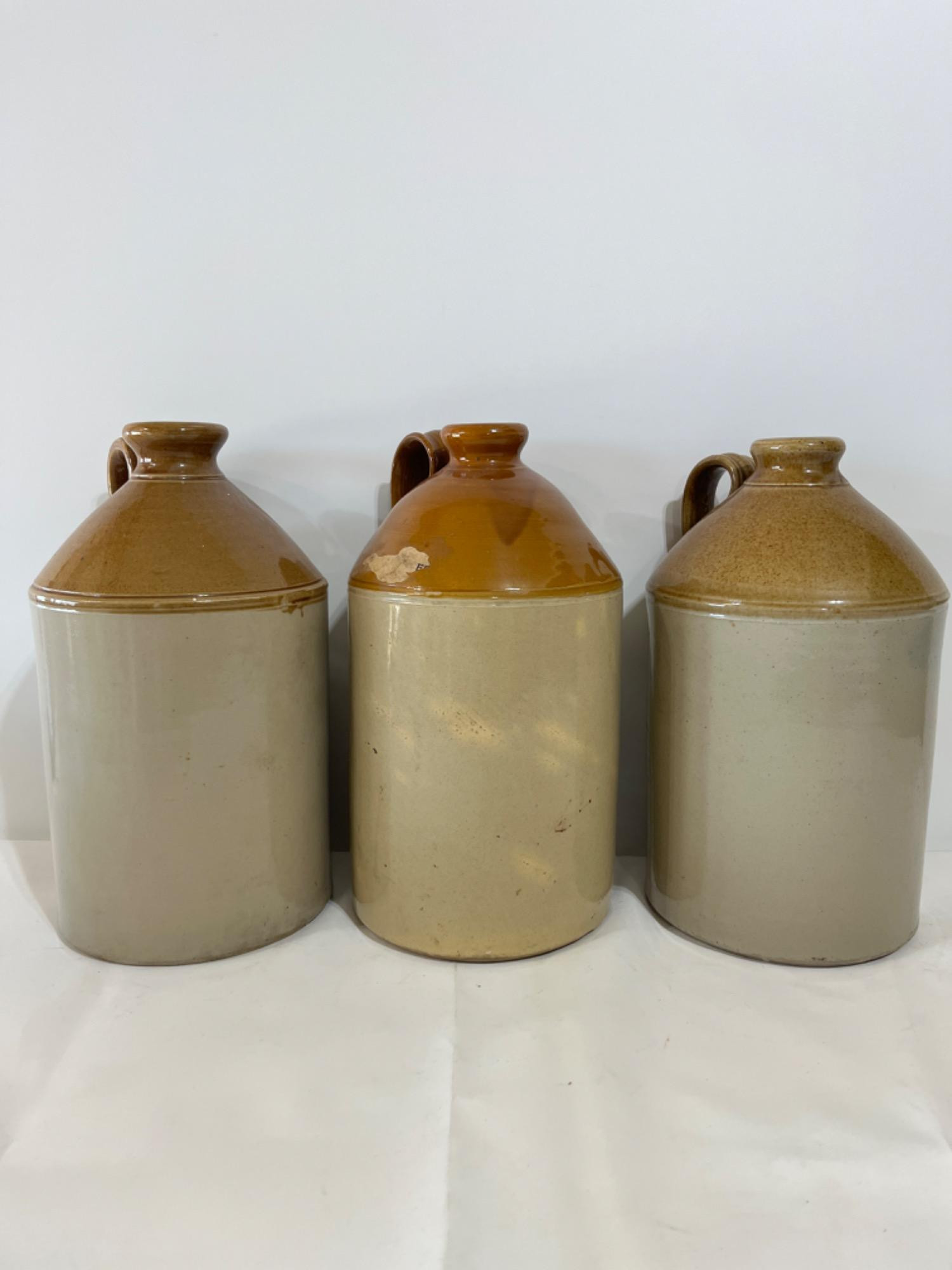 - Antique stoneware liquor jug set. - 3 jugs - Sheppy's Farm House Cider branding - 7" Diameter x 13" Height