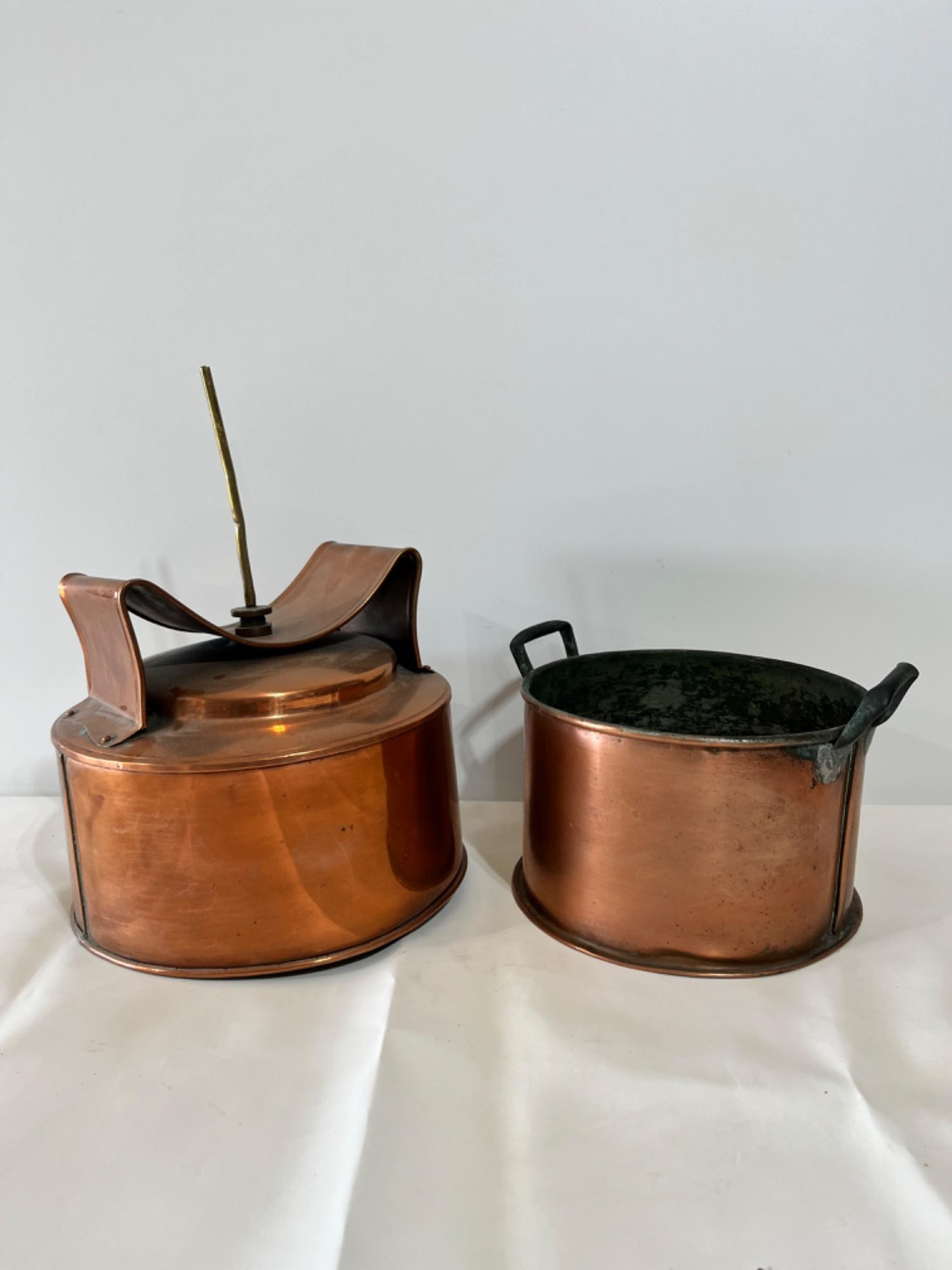 Includes: - Antique copper funnel. - 9.75" Diameter, 13" Height (From bottom to tip) - Medium sized antique copper pot. - 8.5" Diameter, 5.5" Height
