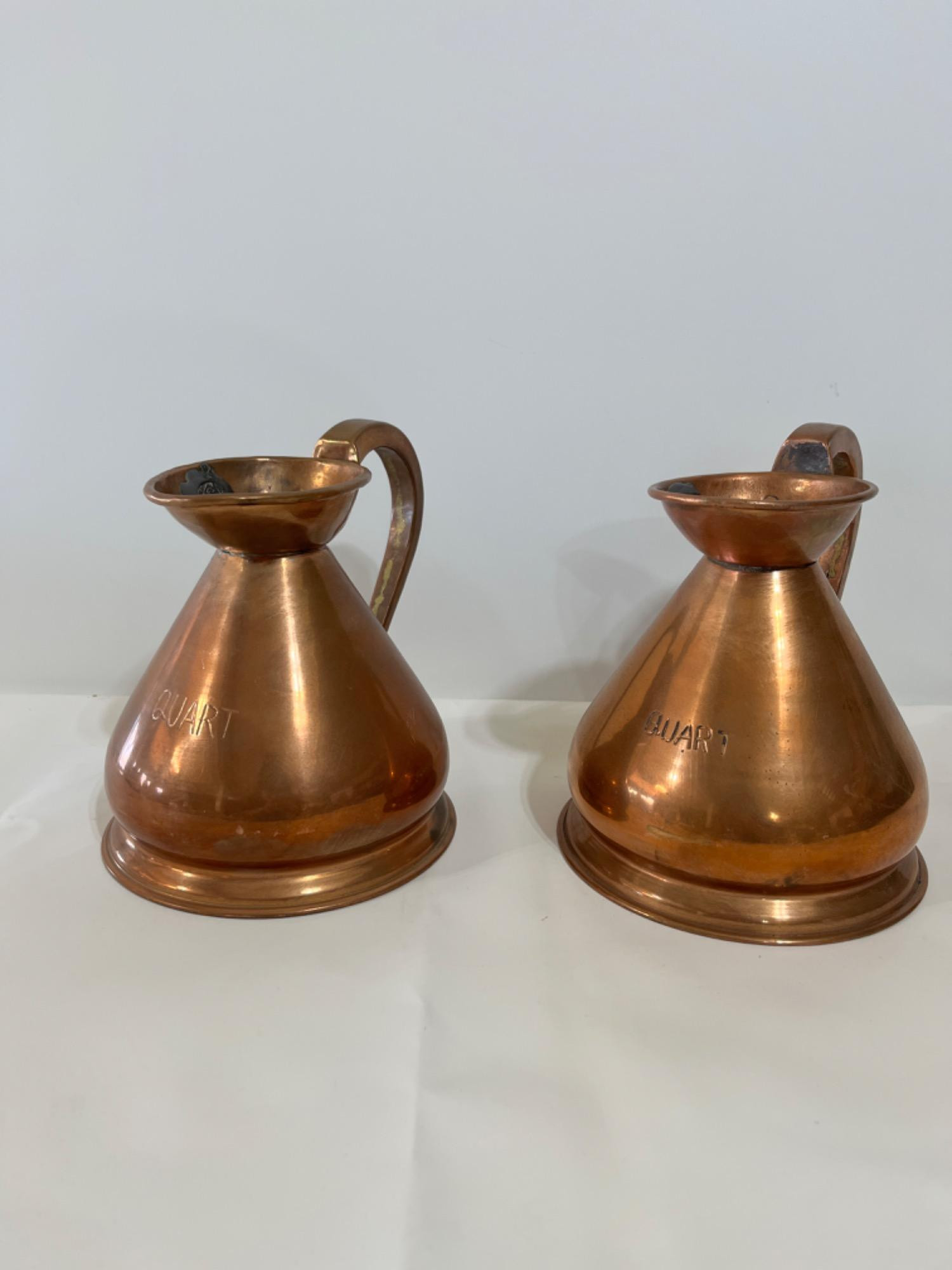 - 2 small, antique, haystack harvest jugs. - Holds 1 quart each. - Copper with lead stamp. - Normal signs of wear. - 6.5" Diameter at base x 7" Height