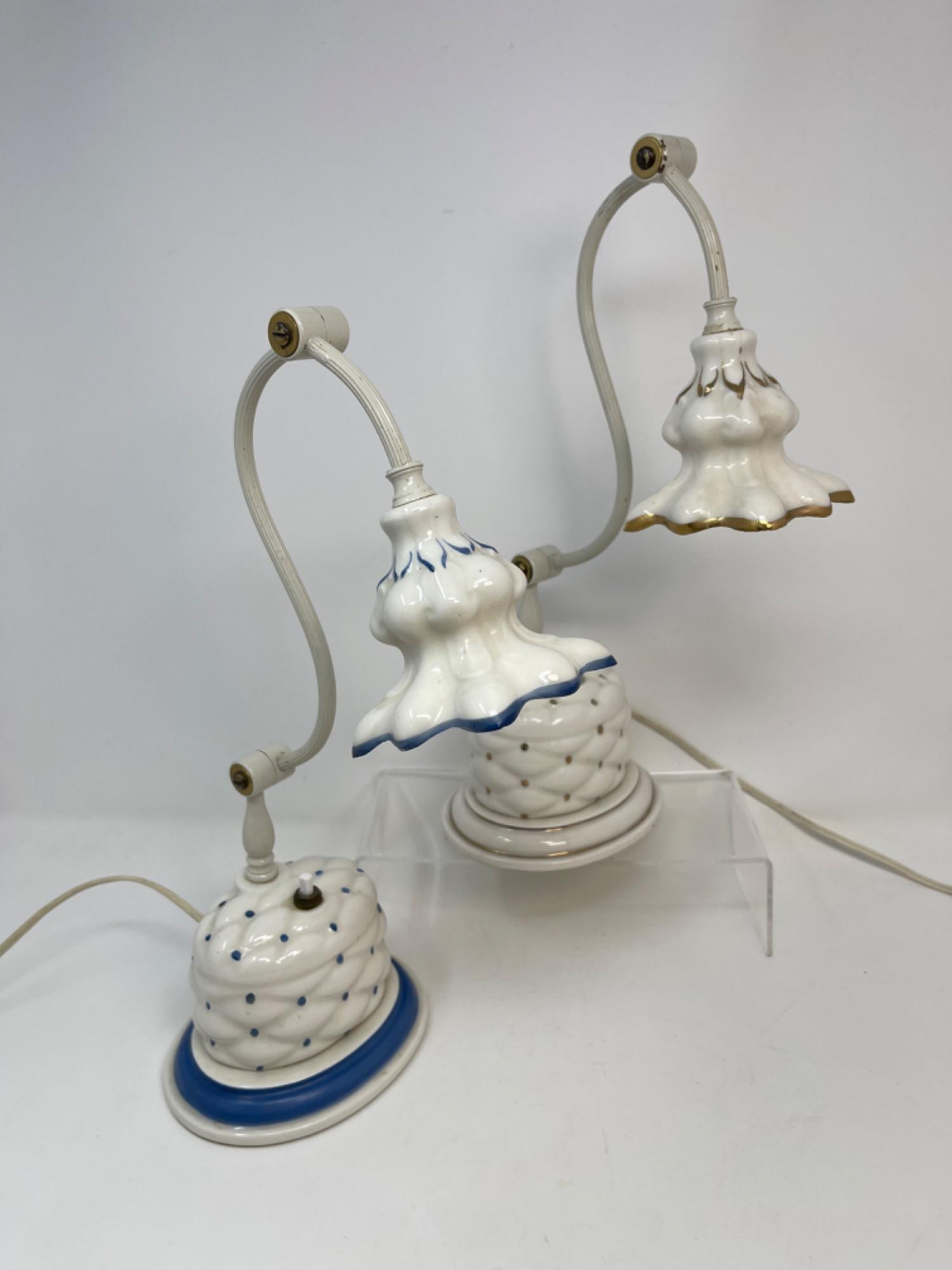 Both are 14 inches tall Both have some tarnishing, staining and minor cracking due to their age, but are in good and working condition. Blue accent lamp’s button sticks a little bit, but still works.