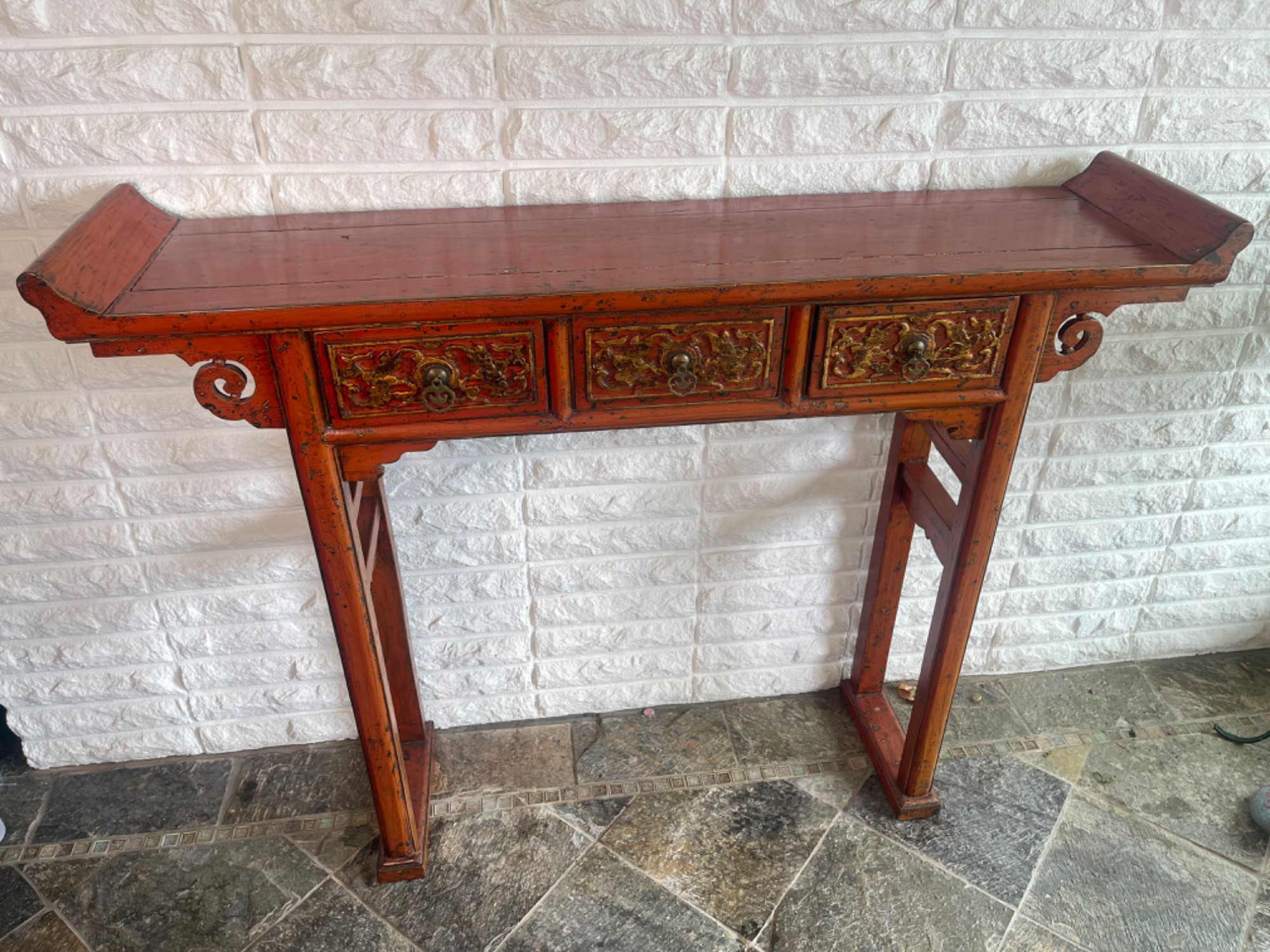There is some splitting and staining to wood. It is shown in photos as best as possible. Measurements: 52.5 inches L X 12 inches W X 41 inches H