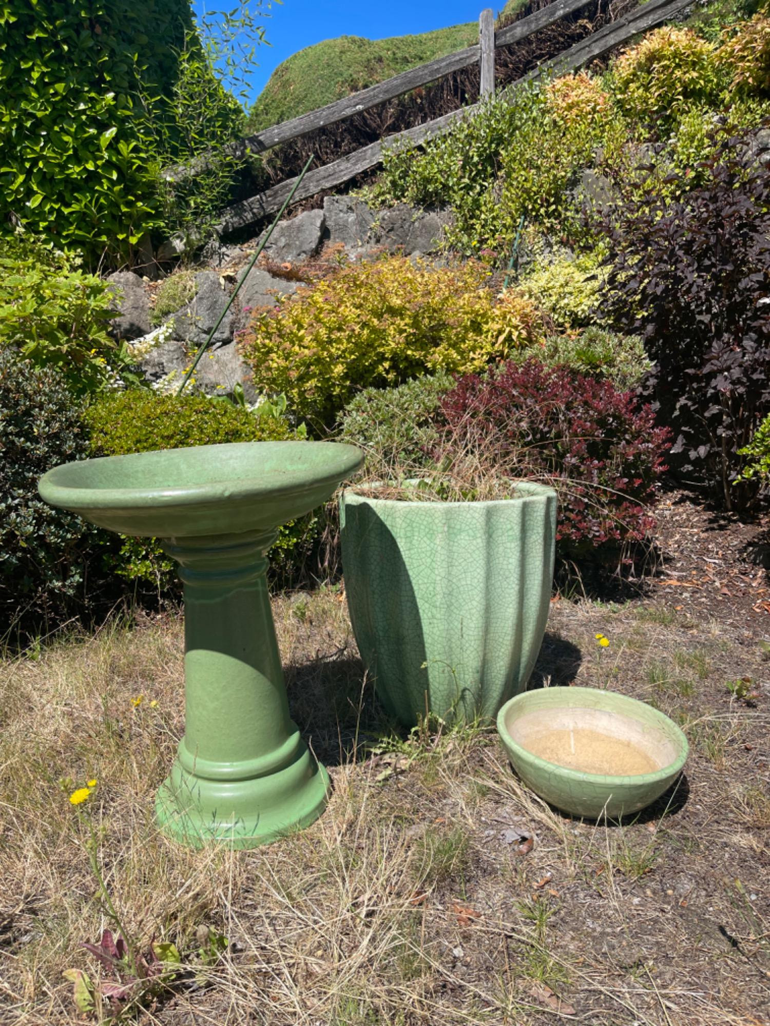 Lot # 127 - Green Ensemble - Bird Bath, Large Glazed Pot and One Small Glazed Pot