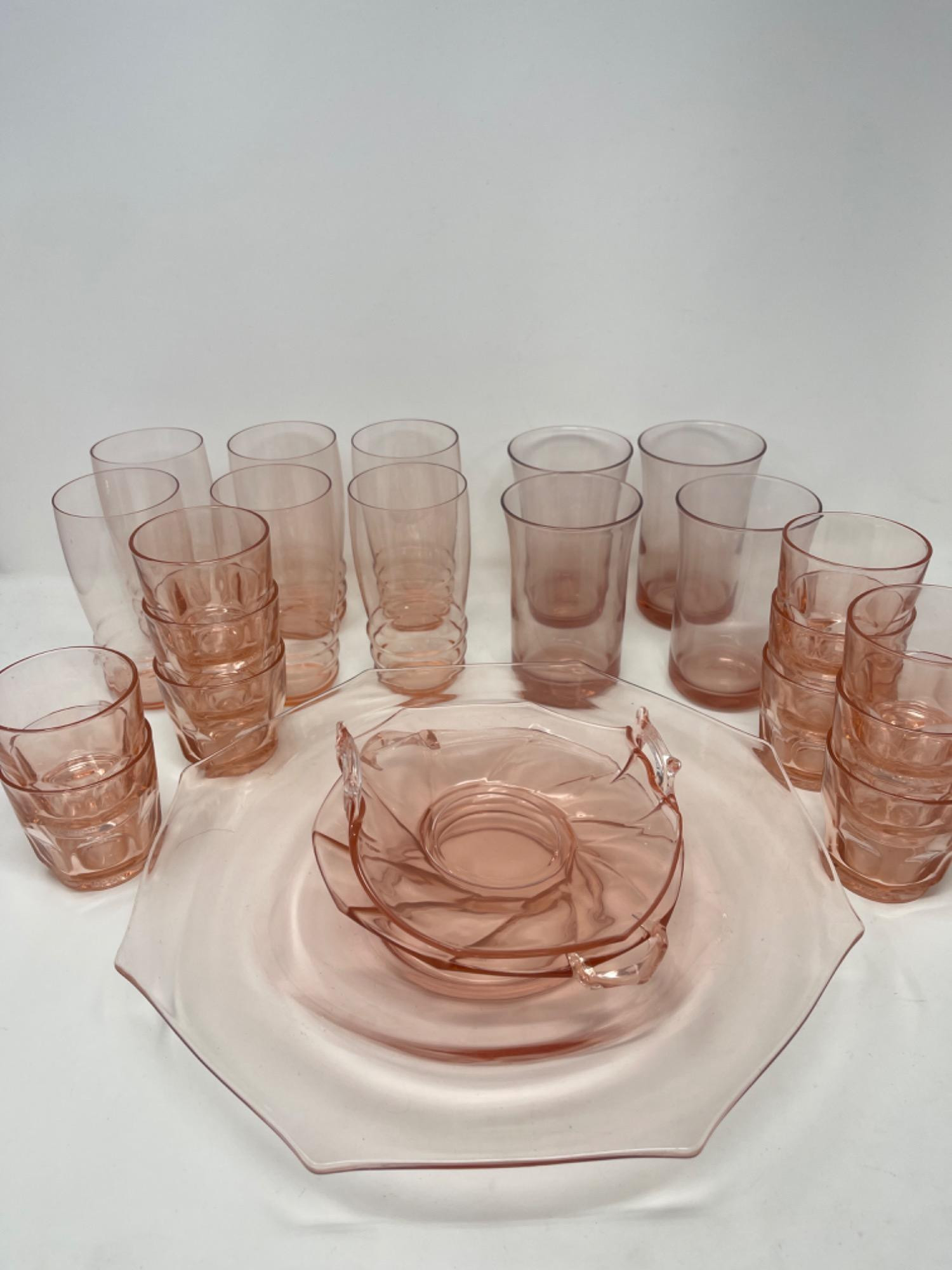 There are a few small cracks and chips, but otherwise in great condition. Largest platter: 12 inches wide Smallest platter: 6.7 inches wide Smallest glass: 2.75 inches tall Tallest glass: 5.5 inches tall