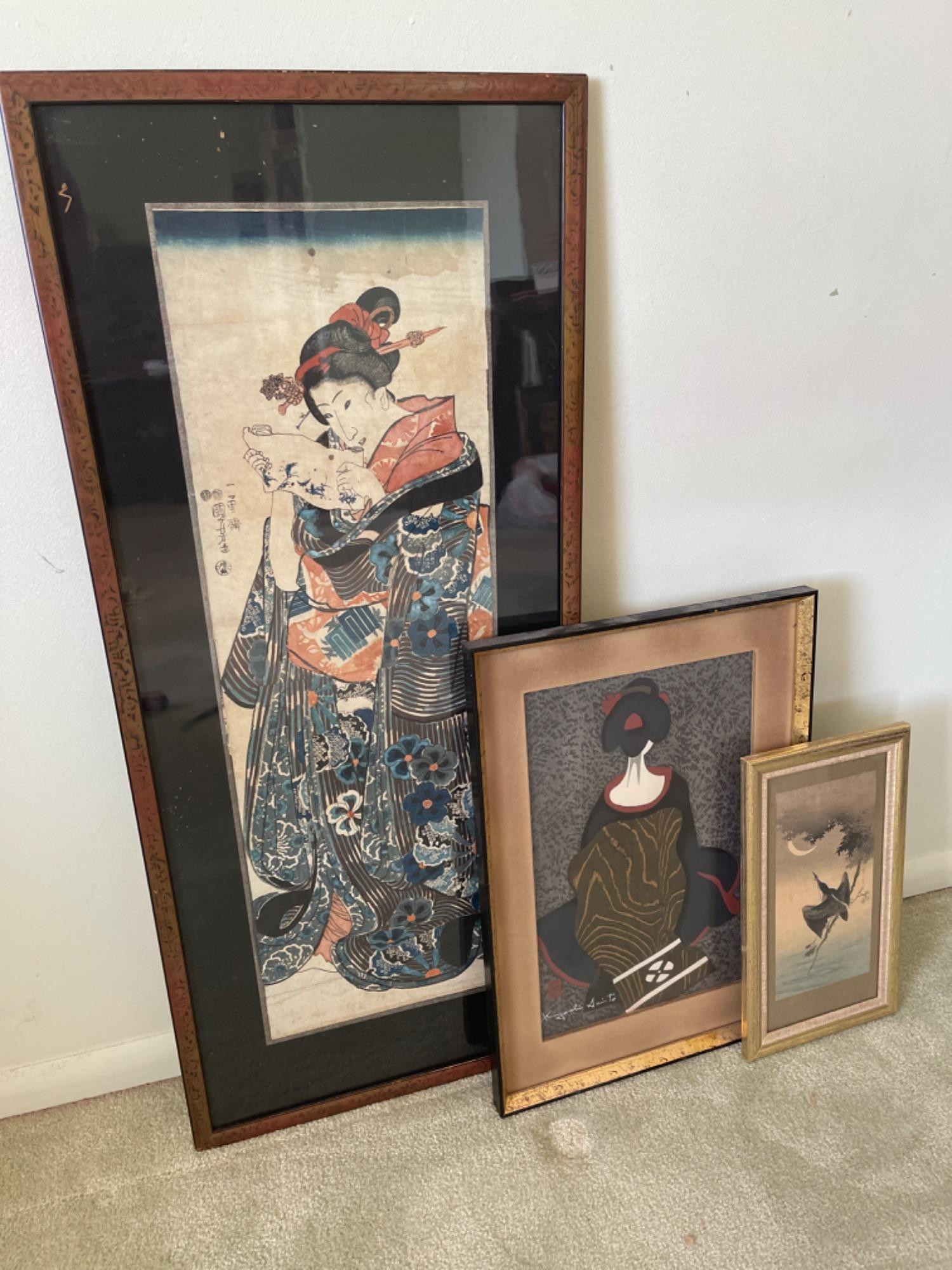 Large frame is very fragile and painting likely needs to be reframed, but both other frames are holding together quite well with very minor scuffs and scratching. Shortest: 13.75 inches tall Tallest: 37 inches tall