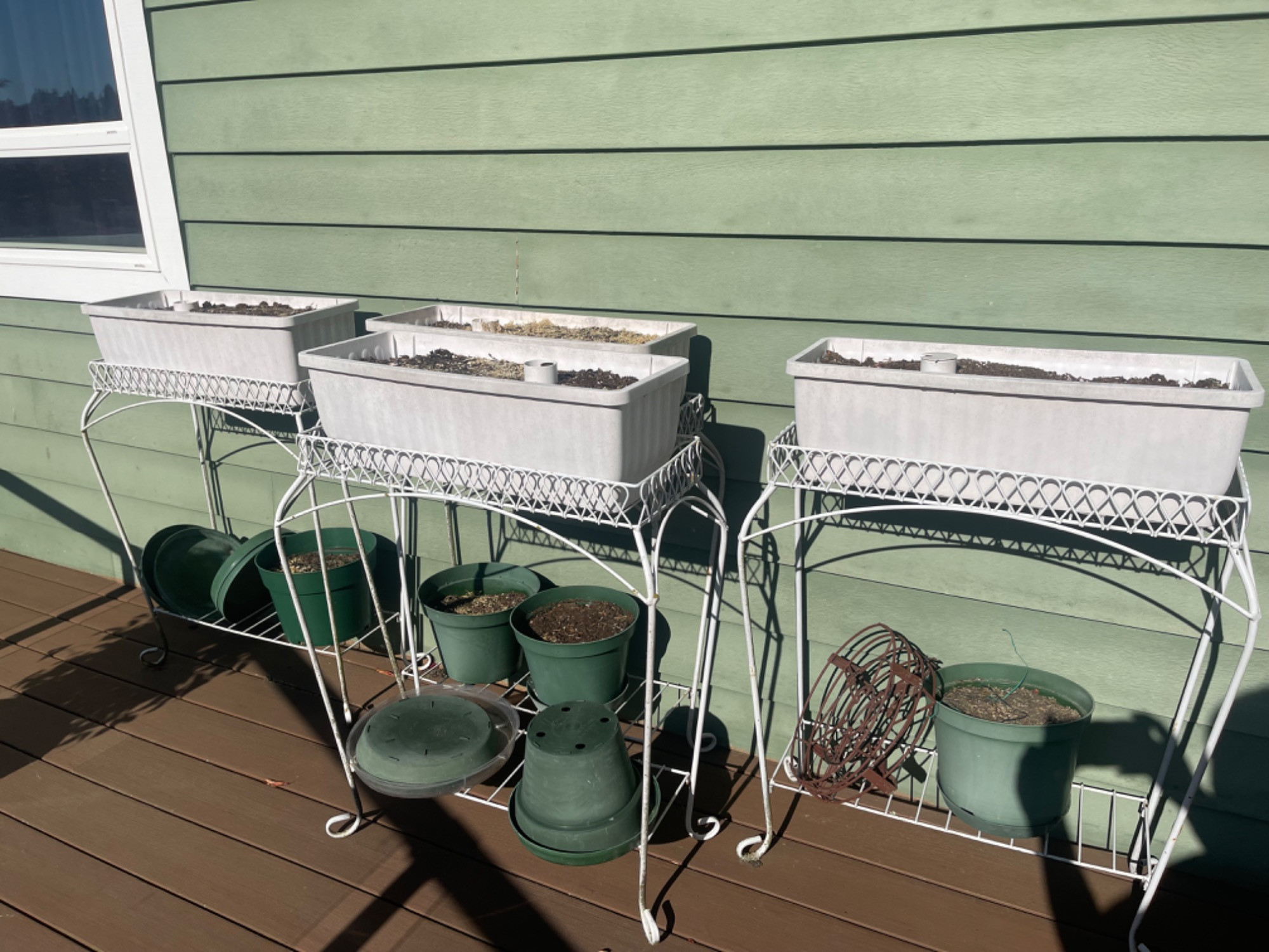 All have wear to paint on metal from being outside, but are sturdy and holding together well. Measurements of planter boxes: 12 inches L x 9 inches W x 30 inches H