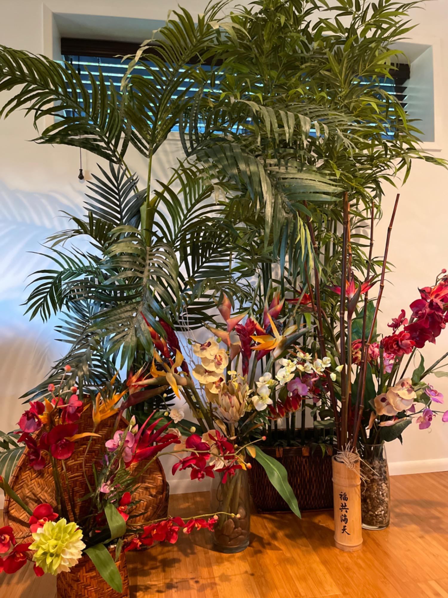 Tallest is about 7 feet tall Shortest is about 30 inches tall All have some flowers or leaves bending in some places, but are in good condition.