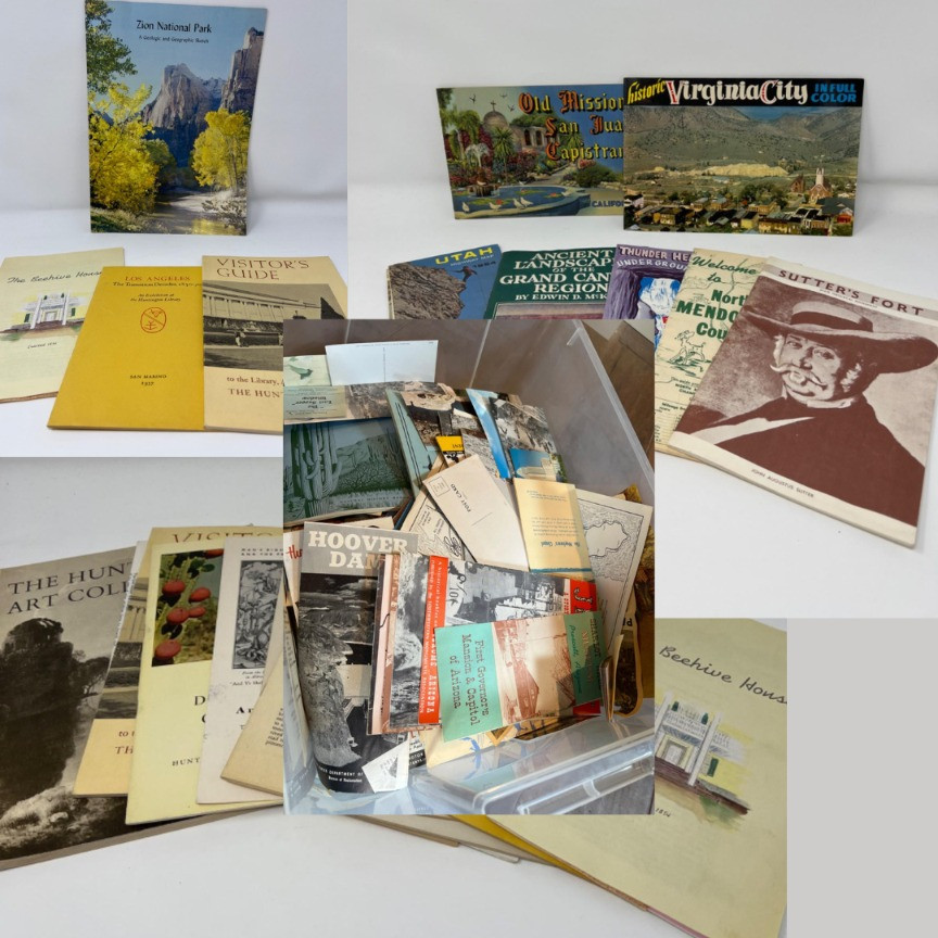 A bin full of vintage post cards, travel brochures, maps from a family members trips to California, Arizona, Utah and other states in the 1950’s.