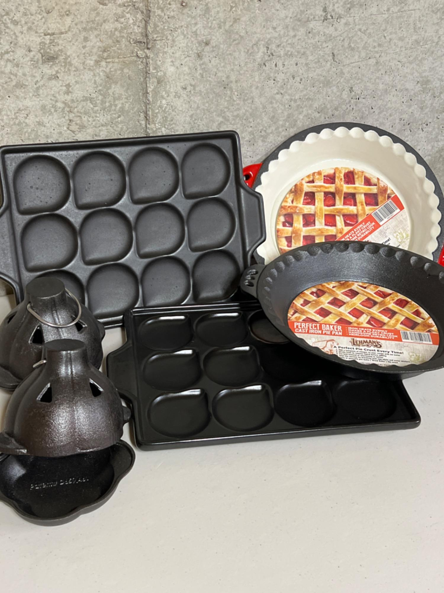 Lot # 210 - Cast Iron Garlic & Pie Bakers and Ceramic Seafood Pans