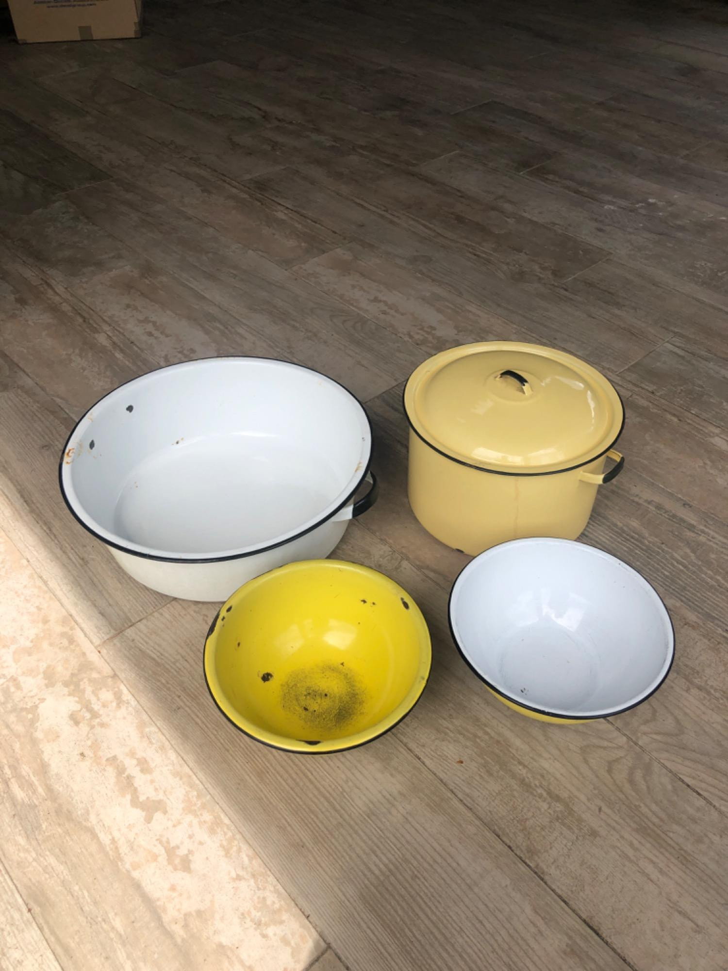 Antique Enamel Pans and Pots Two Small Pans. Dimensions 10 inches wide x 4 inches high Large White Pan; Dimensions. 17 inches wide x 5.5 inches high Yellow Pot with lid. Dimensions 11.5 inches wide x 7.5 inches high