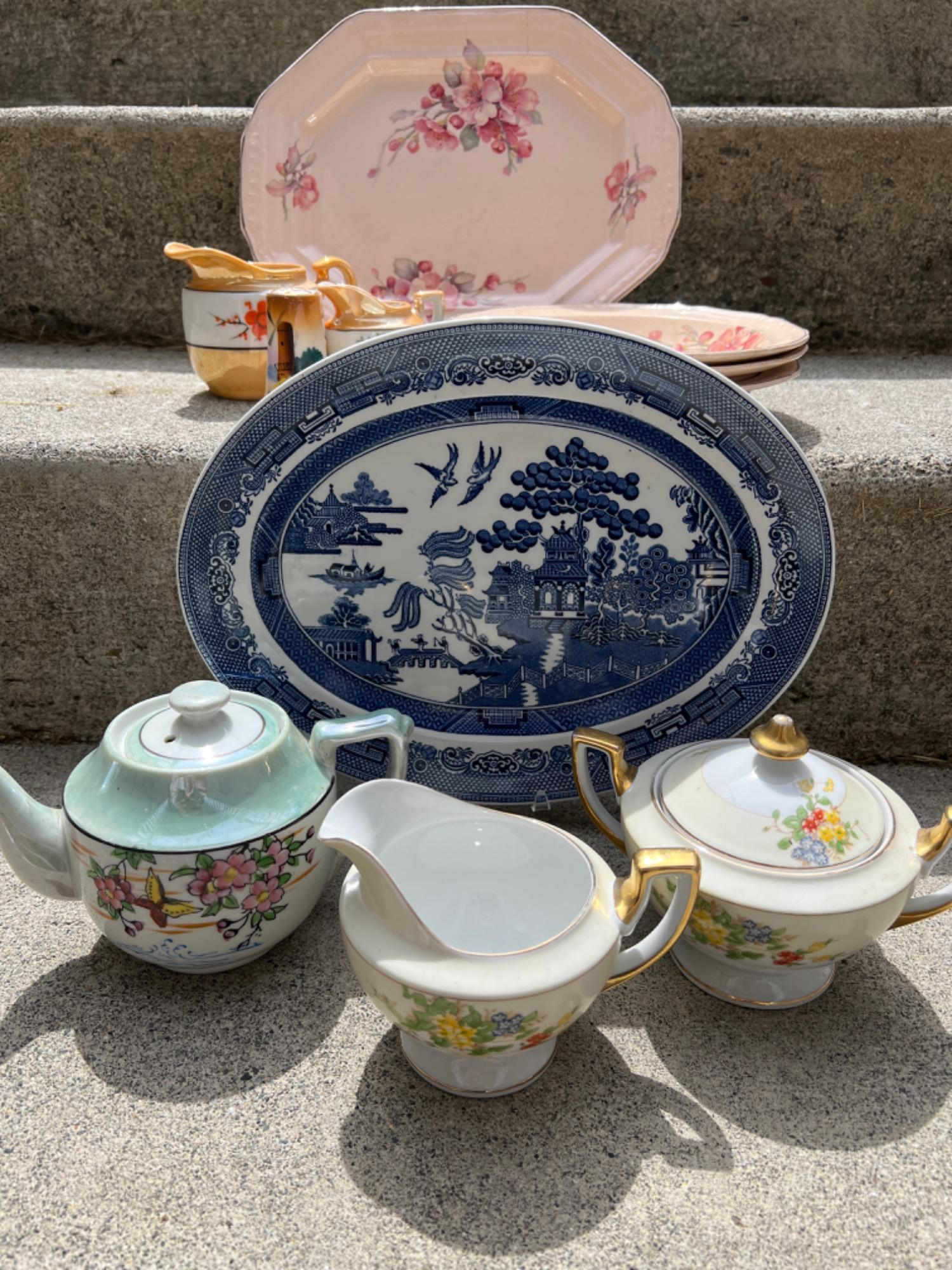 Platters, creamer/sugar, bowls, teapot, plates - variety of mismatched china dishes. 1931 Edwin Knowles Alice Annglow Pink Floral (bowls and platter). Johnson Brothers Asian style blue and white transferware platter. Other china made in Japan - teapot, creamer, sugar, and more.