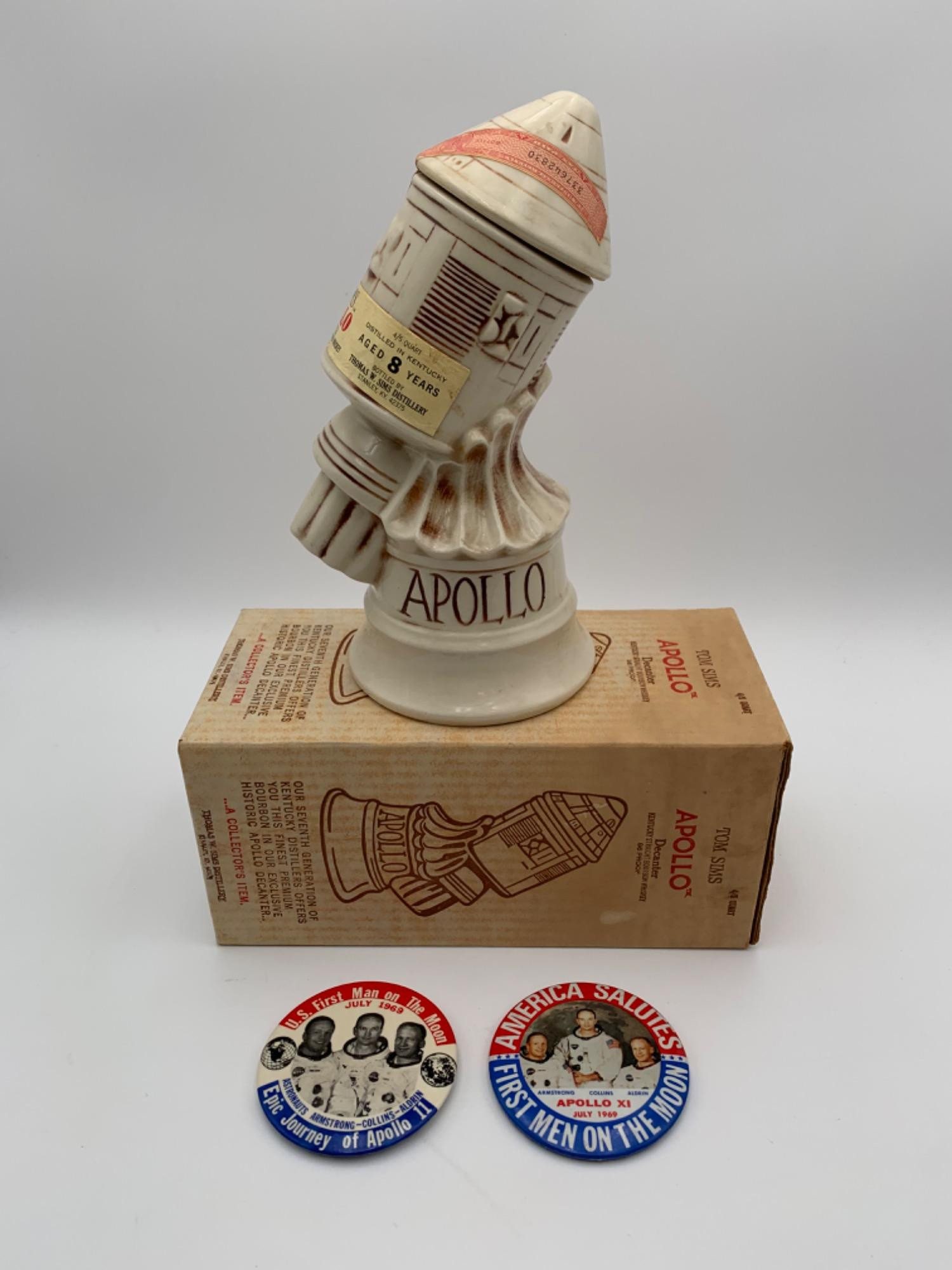 Terrific cultural artifact! Kentucky distiller Tom Sims special decanter from McCoy Pottery to celebrate the Apollo program - circa 1968/1969. In heavy cream-glazed ceramic with corked lid. No chips or flaw noted. Original box in great shape is also included - still has the Washington State Liquor Control Board (WSLCB) price tag on it. Measures 10" H. Bonus of 2 Vintage Apollo 11 buttons celebrating the moon landing! Measure approx. 3" W.
