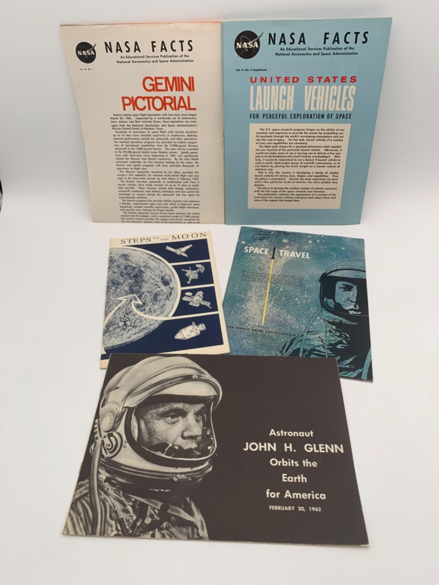 Several brochures/ephemera on various subjects. All are in good used condition - please see photos for your own determination. John Glenn Orbits the Earth for America – 9 page booklet put