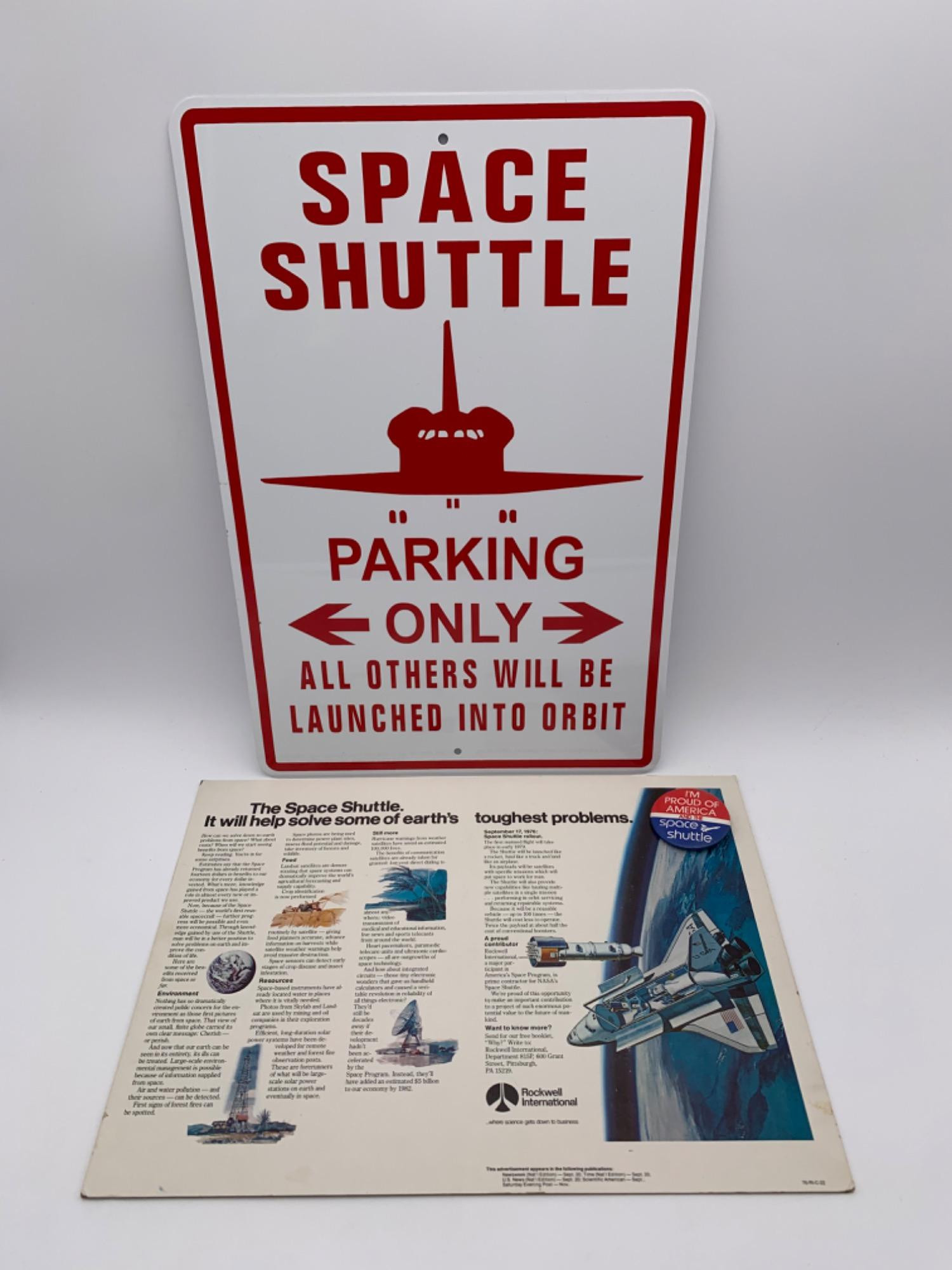 Two signs about the Space Shuttle. Space Shuttle parking sign - heavy aluminum with red lettering. Measures 18" H x 12" W. 2 hanging holes. Great like new condition - appears only to have been used for interior display. Desktop sign outlining Rockwell International's serious thoughts on how the Space Shuttle will change life on earth from 1976. Cardboard sign with back fold-out stand. Measures 11.5" H x 16" W. In great shape with only slightly mashed corner tips. Bonus shuttle pin.