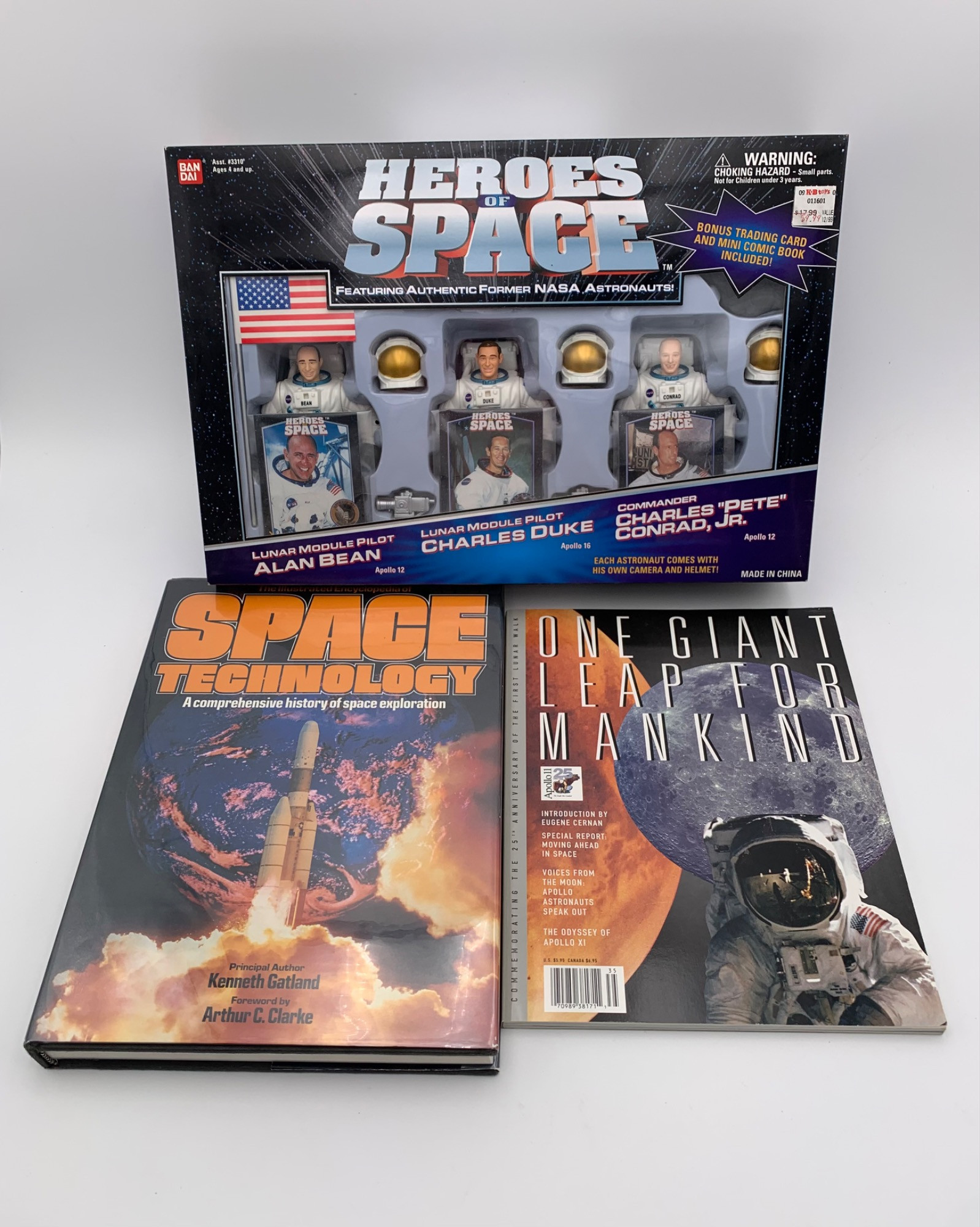 ONE GIANT LEAP FOR MANKIND - softback special commemorative publication from Rococo International. Issued on the 25th anniversary of the first moonwalk. Great overview for the general audience of the space program with lots of photos. Very good condition; appears unused. Heroes of Space from Ban Dai (1999 - model #3319). Three Apollo astronauts - Bean, Duke, & Conrad - are action figures in this set. Each has a separate helmet, personal trading card, and a mini-comic book is included. Figures measure around 5" H. Appears to be NIB - please see last 2 photos of tape seals. SPACE TECHNOLOGY - A COMPREHENSIVE HISTORY OF SPACE EXPLORATION by Kenneth Gatland. Hardcover with dustjacket/plastic protector. 1981, Salamander Books (London UK). 288 pages with several multiple-page fold-outs and wonderful photos/illustrations. Lots and lots of information and a timeline included at the end. In very good condition. Note: these 3 figures are also available in Lot #65 accompanied by Power Ranger Figures for each.