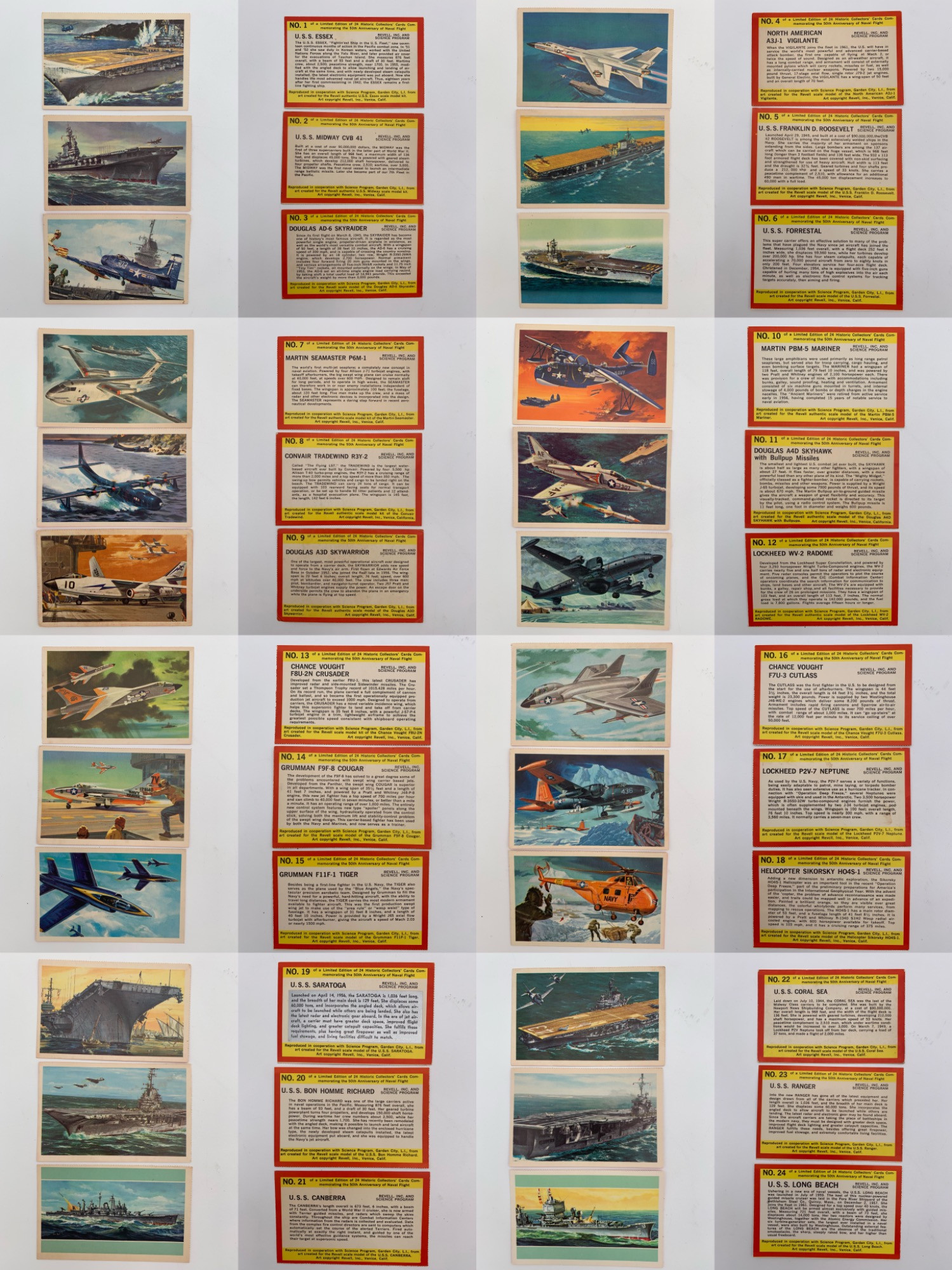 Complete set of Revell's Historic Collector Cards celebrating the 50th Anniversary of Naval Flight. All 24 are here. This is the first series based on the Famous Artists Series of 1960 a year before the "divorce" between Revell & Artists Guild cards in 1961; they were included in Revell's model kits of the time. Cards measure 2.5" H x 4" W. All are in excellent condition - please see pictures to determine for yourself.