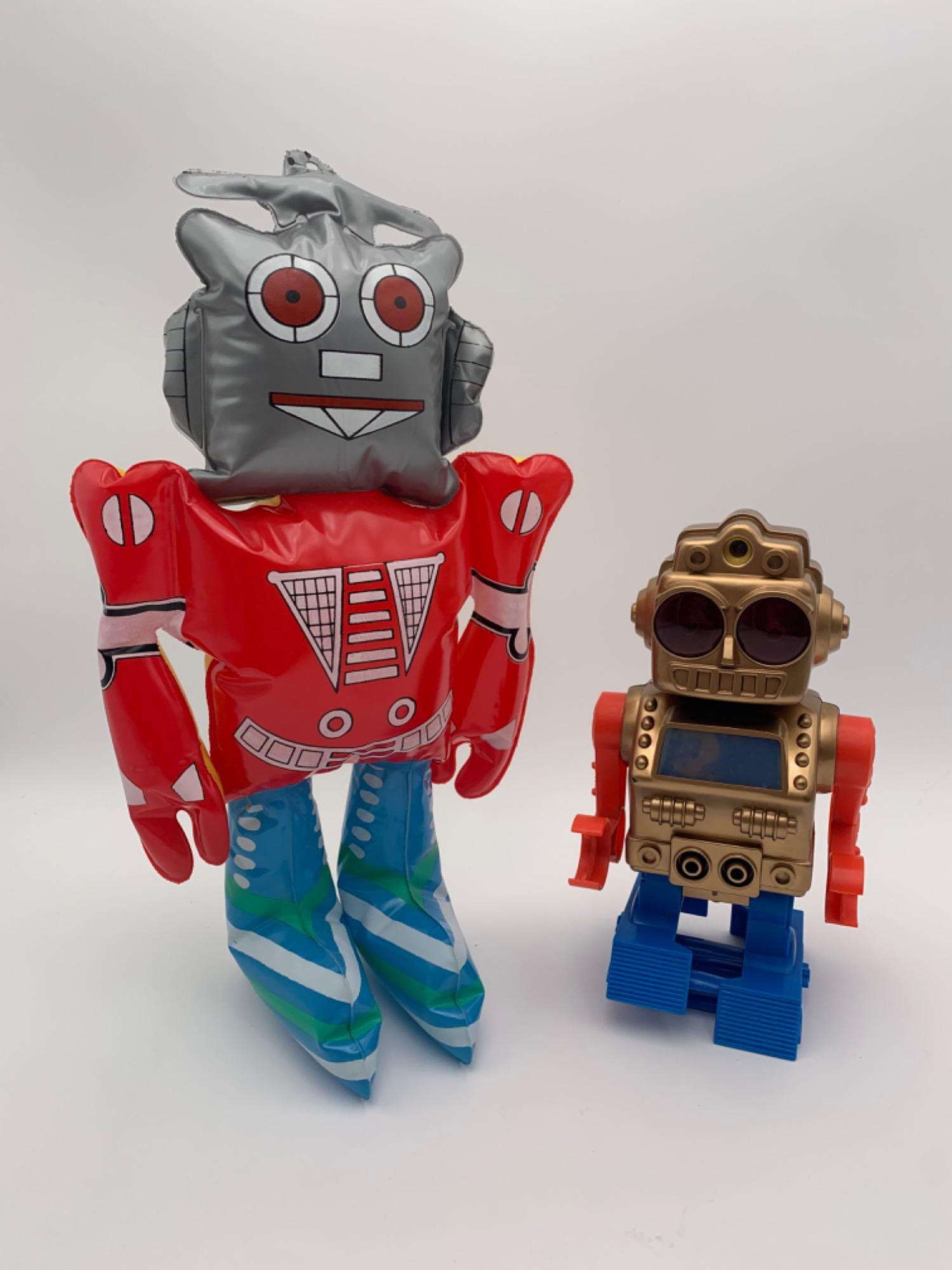 Mr. Space Monster walks along on 4 "AA" batteries with light-up eyes and a really jarring beeping sound - and it's LOUD. He has a gold body, orange/red arms, and blue legs. Batteries are in the head. He stands about 9.5" H and when he's not on, you can see that the panel in his front has a outer space scene (hard to make out when photographing him moving). There's a dial on his back that says "up and down", but we can't figure out what it does other than perhaps raise the level his legs lift? Regardless, he's a great example of the wonderful toys that used to come out of Hong Kong in the 1980s. Only major flaw is shown in last picture - missing some paint on his head. Blow-up robot holds air well and can stand on his own or be hung from the loop on his head. Measures about 15" H.