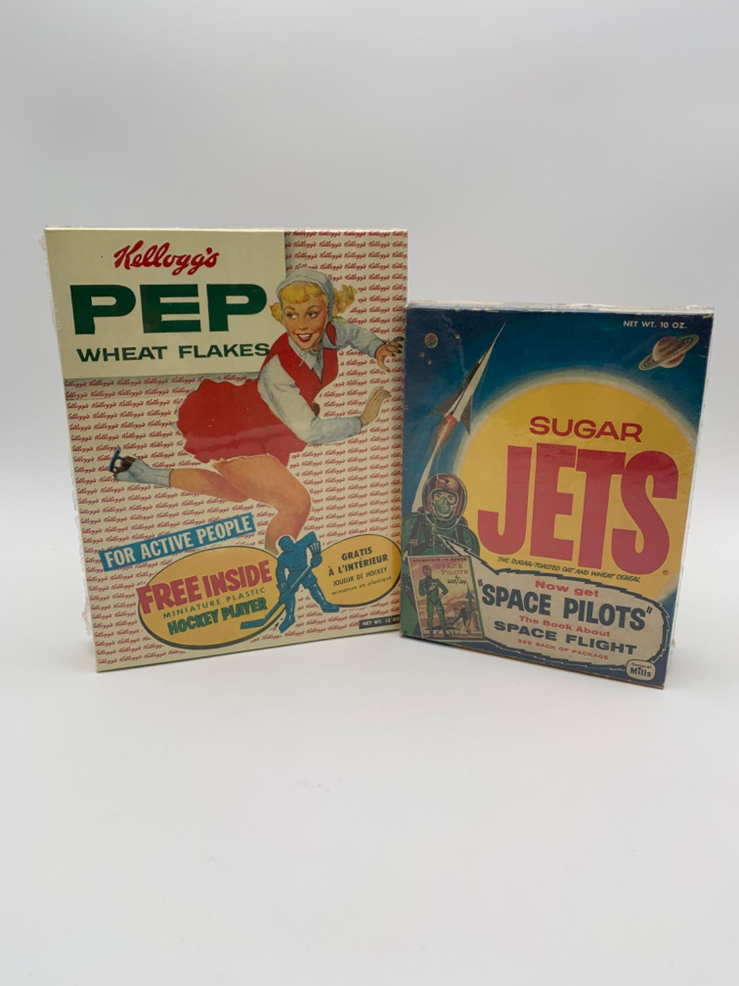 Pair of vintage cereal boxes from Kellogg's & General Mills. Both advertise space-related premiums on the backs and are shrink-wrapped in plastic. We believe these are vintage rather than reproductions given our client's penchant for authenticity and the way the cardboard box has aged over time. However, we are not experts, so you cereal box collectors please look closely and determine for yourself. Kellogg's PEP cereal box - in wonderful shape with very little yellowing and no noticeable flaws; 12 oz. package with advertising for "outer space fleet" rockets and launchers premium on the verso. Note that this box is from Canada and French is included along with English (very Canadian - note the advertised [not included] hockey player figure inside!). Measures approx. 10" H x 8" W x 2" D. General Mills JETS cereal box - in good shape with only slight wear on some of the edges that had dark pigment printing. 10 oz package with advertising for a "space pilots" book premium on the verso. Love that the address to send for the premium is "Minneapolis 1, Minnesota"; pre-zip code! Measures 8.75" H x 6.75" W x 2.25" D.
