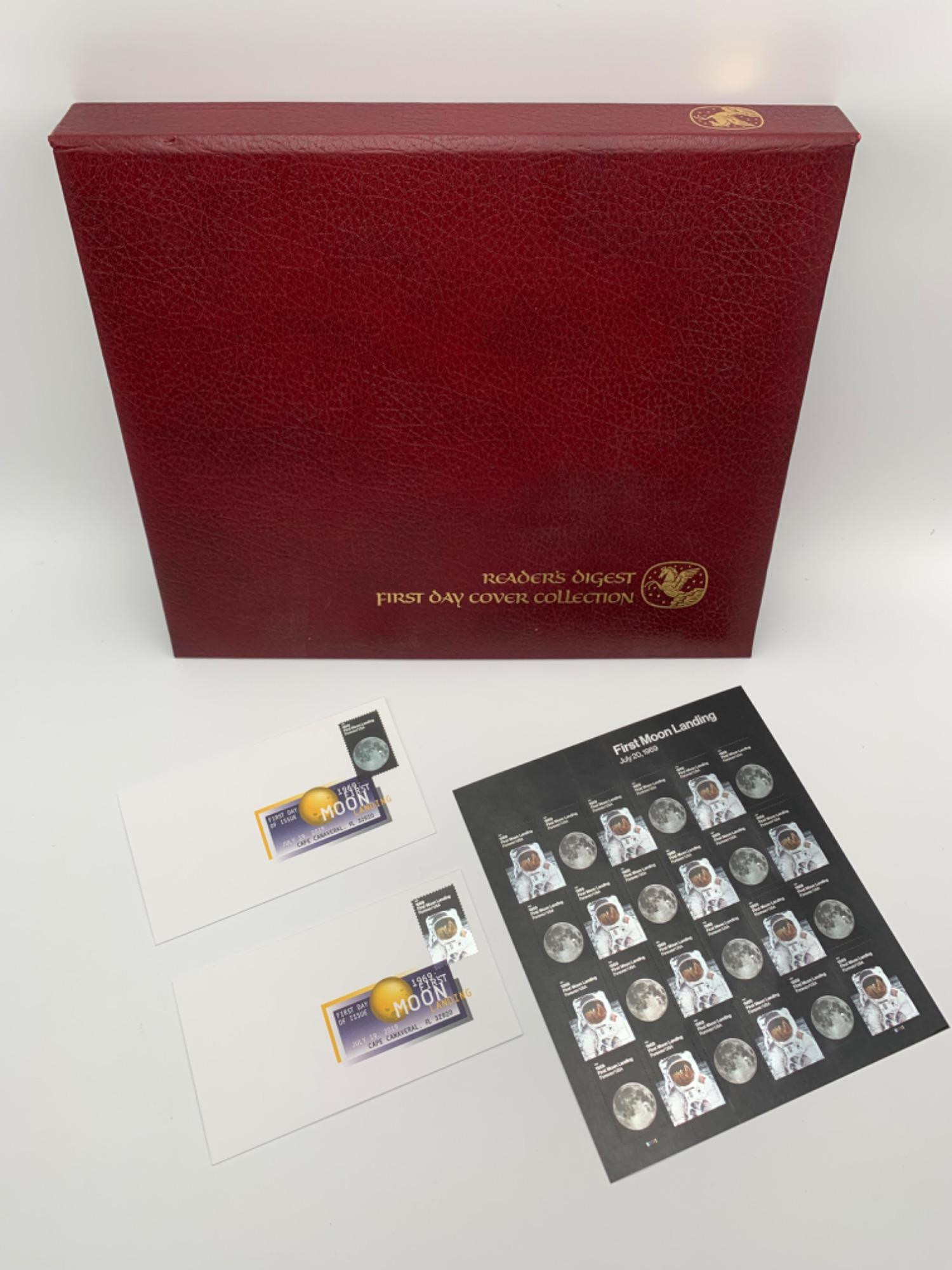 condition. The whole set is pristine in condition and comes in a large padded 4 ring burgundy-colored binder to protect the pages. Binder measures 12" H x 14.5" W. See photos for details. 24 First Moon Landing Stamps – July 20, 1969 – issued in