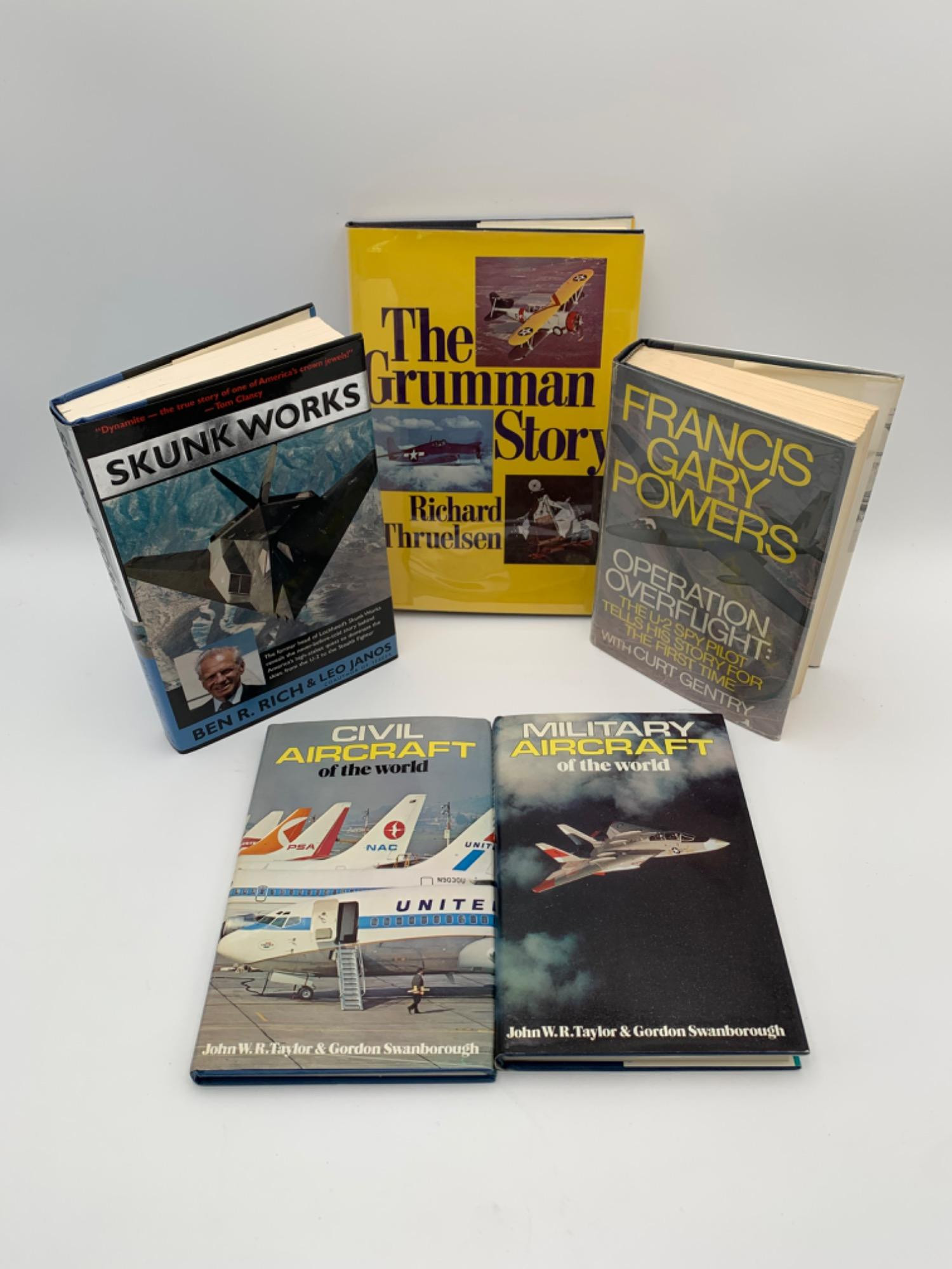Books centered around military craft (the last book on civilian airdraft was added since it is the same format by the same authors as the 4th book). All are in good condition with the exception of a grease stain on the back cover of the U-2 book. Several appear never to have been read. Please see photos for details. THE GRUMMAN STORY by Richard Thruelsen. Hardcover