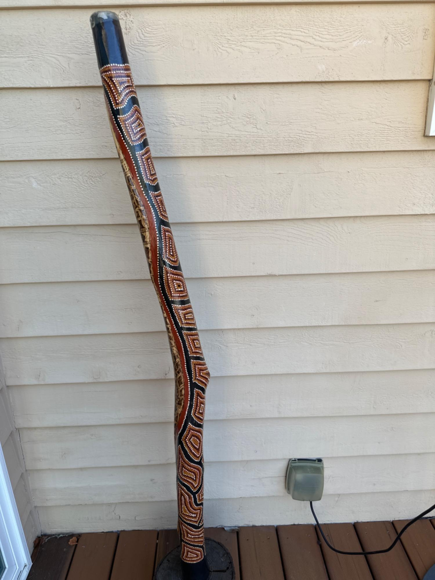 Strictly speaking, a didgeridoo is a cylindrical or conical instrument anywhere from 1 to 3 meters long, with most at around 1.2 meters. The longer the instrument the lower its pitch, with flared instruments given a higher pitch than instruments of similar length. A wax mouthpiece is sometimes used; forming a better seal. It is technically a wind instrument, similar to a straight trumpet. It has also been referred to as a “dronepipe”. Hand Painted Australian Didgeridoo On Stand-5 Foot Apprx.