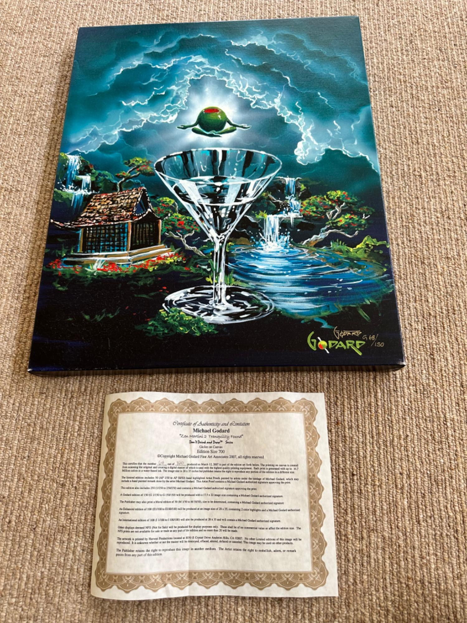 Michael Godard "Zen Martini 2 Tranquility Found" Signed Giclee LE W/CO Measures 17.5 W x 22 T 68/150 About the Artist: Michael Godard is known as the explosive “Rockstar of the Art World” and global top selling artist!His world of art invites us to see his lighthearted perspective, surrounding us with animated olives, grapes, and dancing strawberries. His unique portrayal of fun is an exciting combination of imagination and subtle humor, evoking the creative side in “Olive” us. He has redefined art as we know it and, of course, given it a punch line. His paintings are thought provoking and full of enigmatic illusion. They show pain, love, conflict, and success, making people smile, laugh, reminisce, and exclaim, “Oh My God..ard!” Godard’s work is highly collected by young and old from all walks of life including movie stars, rock stars and private collectors. “We both love to see people respond to our art and it’s probably why we’ve been given a gift to create and entertain. Get ready to go crazy over the artwork of Michael Godard” -Ozzy Osbourne. Godard’s imaginative world of art is seen by millions of people each month, worldwide through cruise lines, galleries, hotels, television, magazines and countless merchandising kiosks and stores. His paintings even adorn the walls of the Officer’s Lounge in the Pentagon.