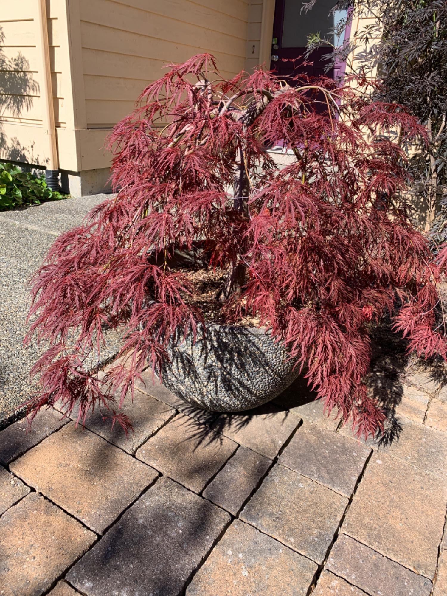 Aggregate Concrete Planter with Healthy Red Japanese Maple Tree. Heavy, bring help. Dimensions are 22.5 inches in diameter, 14.5 inches tall. Pot with Tree is 35 inches tall, and approximately 56 inches wide. Very heavy, bring help to load. Very healthy red Japanese maple tree.