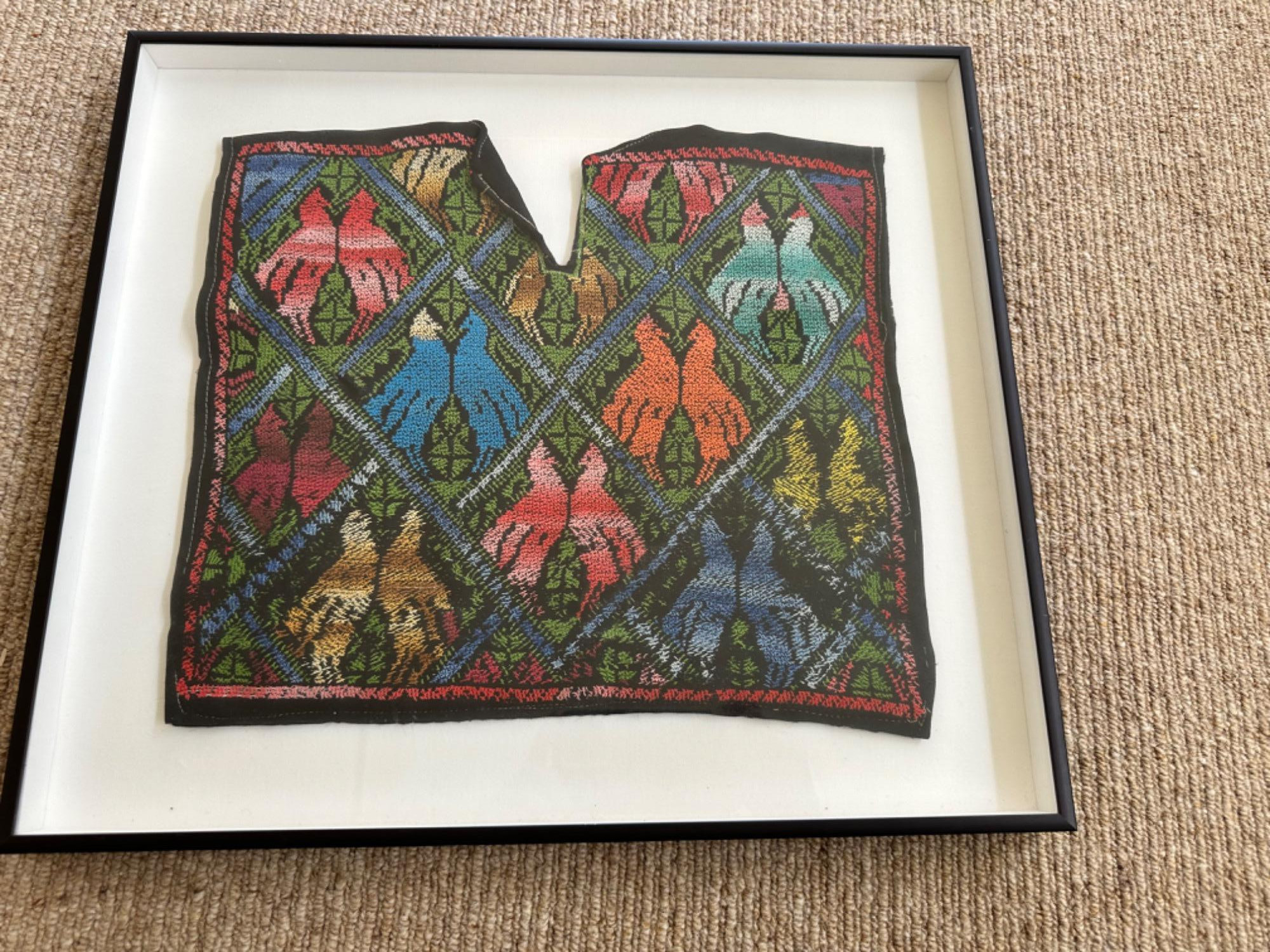 Palistine Textile Colorful Dove Framed Needle Work. Measures 18.5 W x 16.5 T