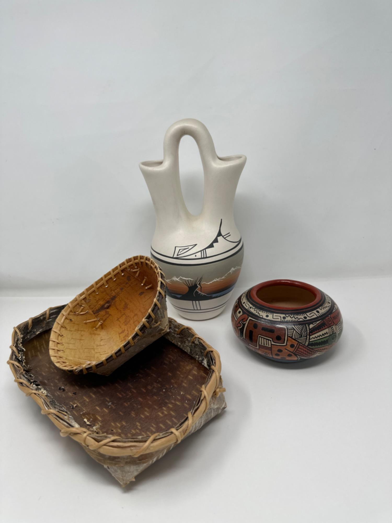 Native Birch Baskets, Signed Weddig Vase & Signed Mario Martinez Bowl. 10 x 6.5 large Birch Native American Basket 6 x 4.5 Small Birch Native American Basket Wedding vase, signed 10.25 T vase Polychrome bowl, signed Mario Martinez 4.25 W x 3 T Small Bowl