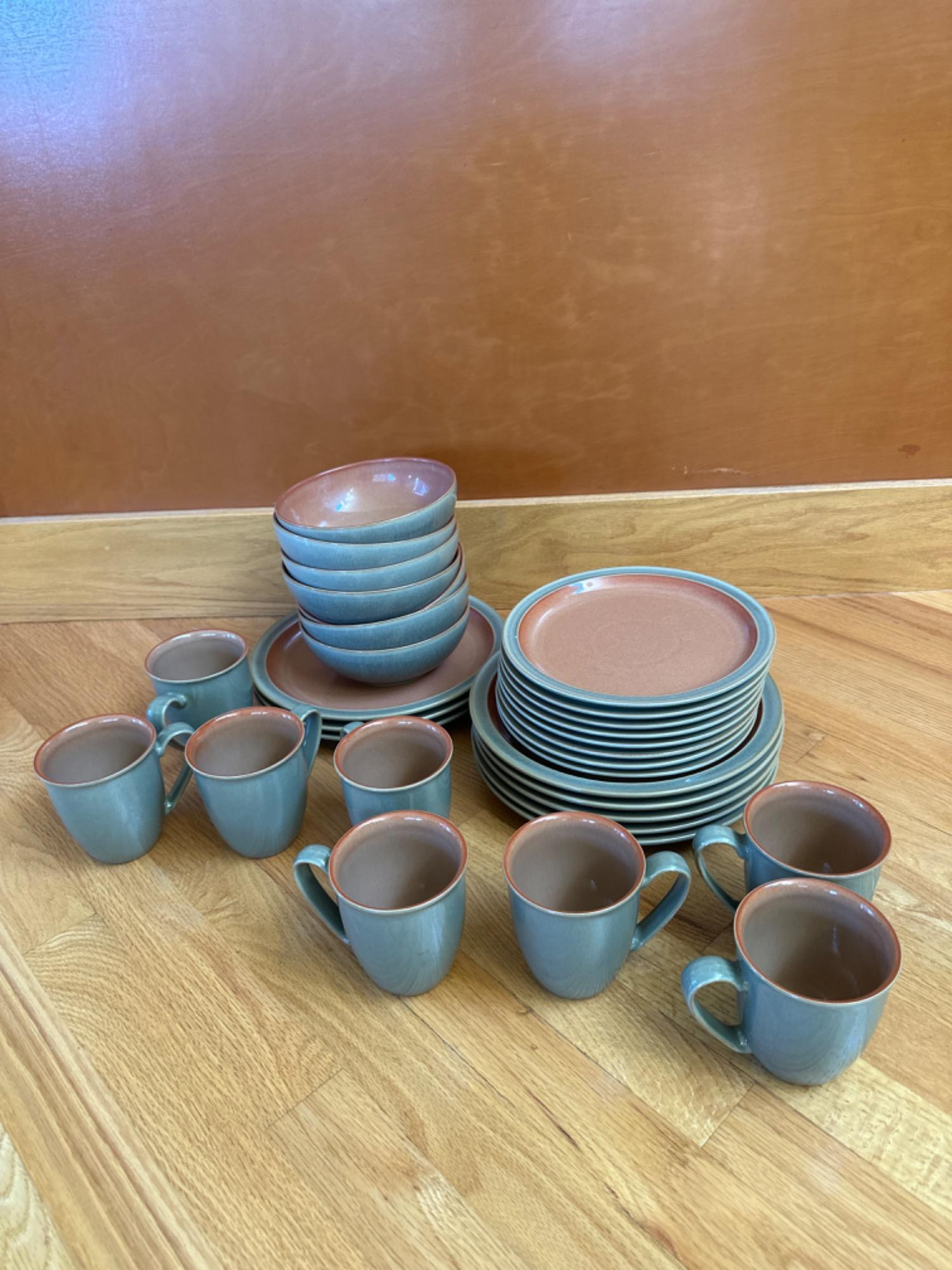 Denby Stoneware Plates, Bowls and Cups 4” Cups eight Total 10.5 D- Eight Total 6.5 x 2.5 T- Seven Total 8.5 plates- Eight Total