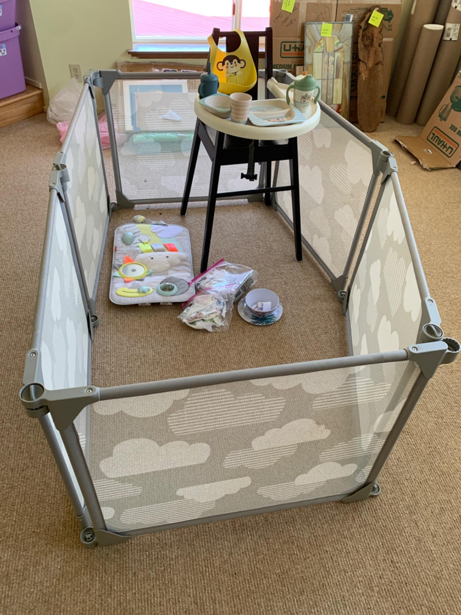 Like New Skip Hop Baby Playpen, IKEA Highchair and Other Baby Items. 26.5 inches tall, 37 inches wide, 70 inches long. Portable and modifiable. Each panel comes apart. Hi-chair dimensions are 37 inches tall, 19 inches wide, 21 inches long.