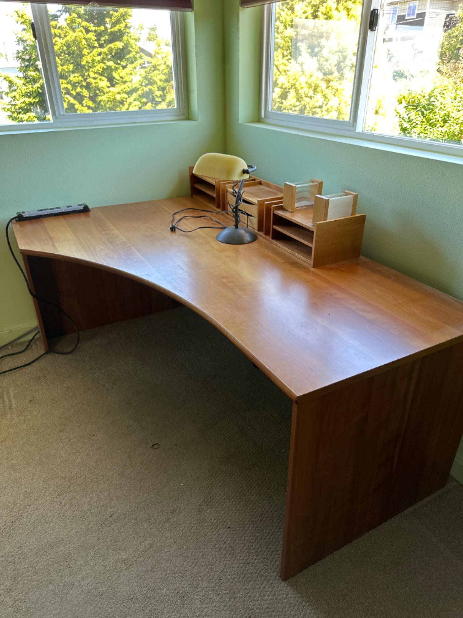 Danish Style Desk In a Teak Veneer- Corner Desk-All Items Included. Desk organizers, Lamp and Power Strip Desk measures 6 feet wide 4 feet deep at the west part the nest 29 1/2 inches deep by 29 inches tall with everything you see in the picture
