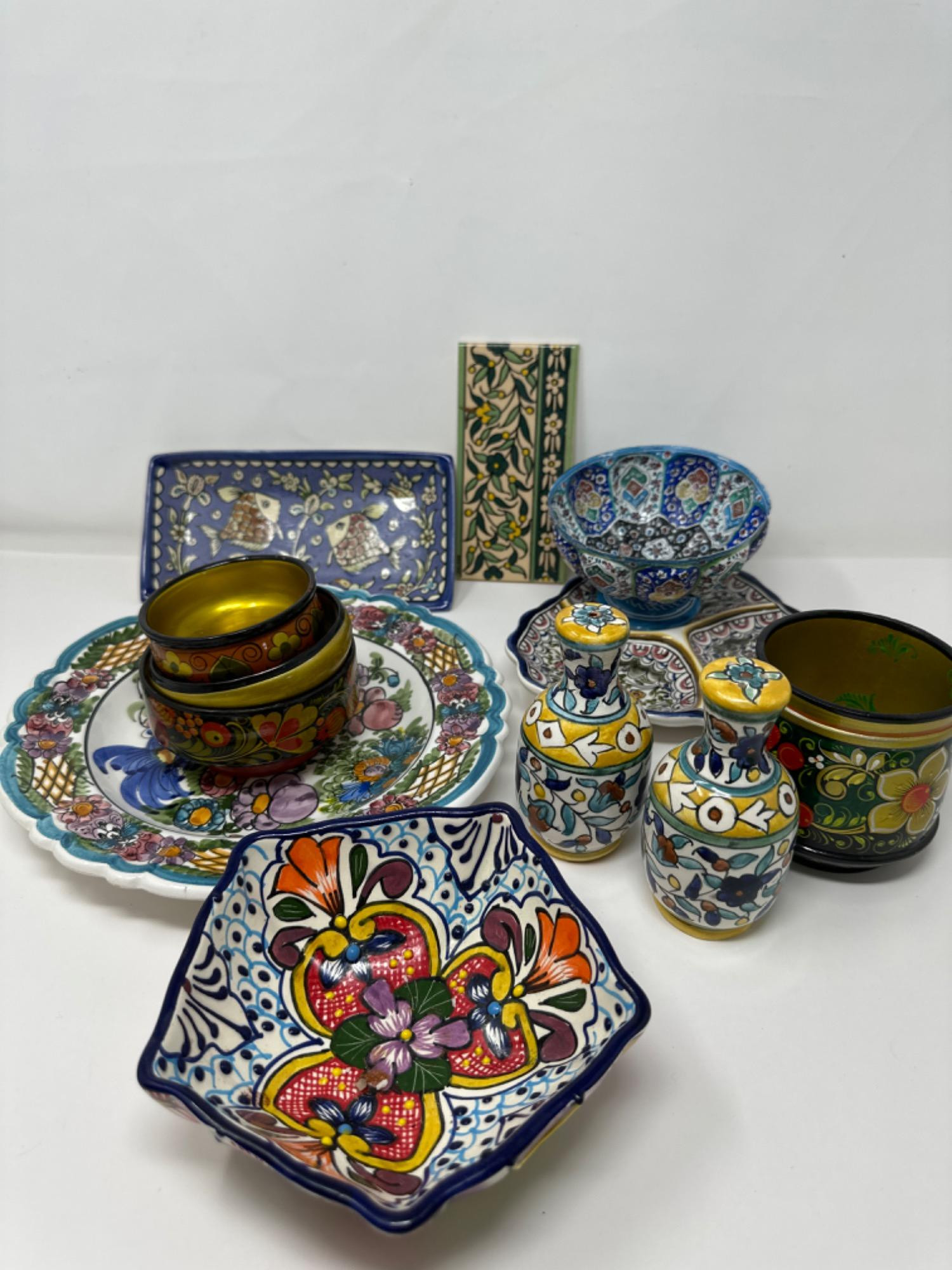 Variety Of Folk, Russian and Greece Serving Pieces. Salt and pepper shakers measure 4 1/2 inches biggest plate measures 9 1/2 inches smaller items range from 5 to 6 inches in length