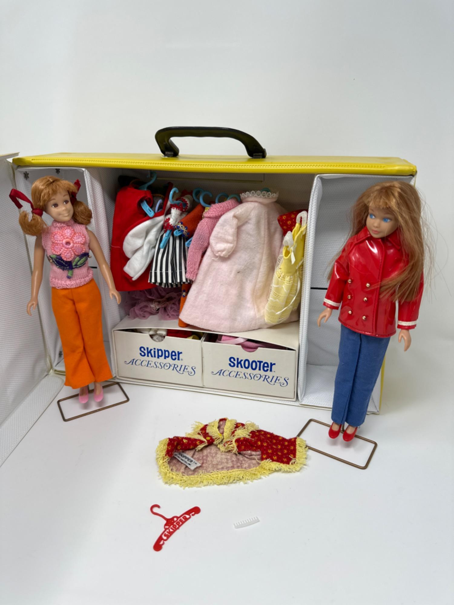 1960s Skipper and Skooter Barbie Dolls With Case and Clothes. All items are in good condition.
