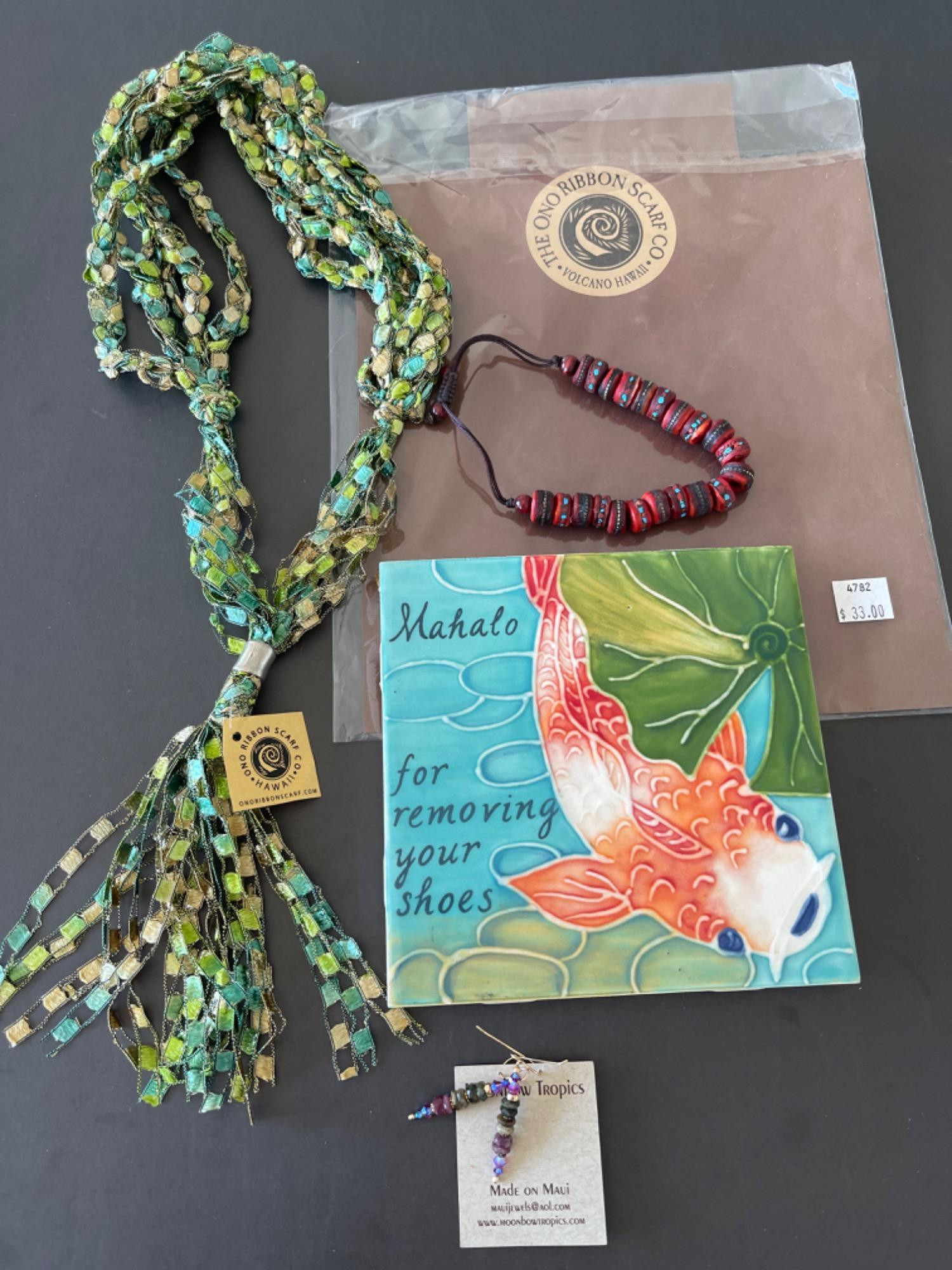 Lot # 81 - Hawaiian Artison Items- Hand Made Scarf, Painted Tile, Earrings & More