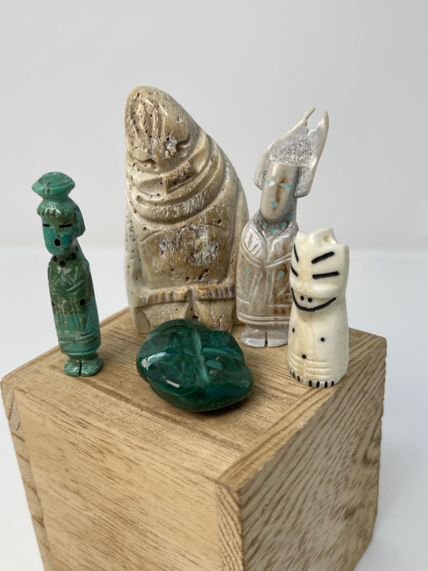 Turquoise Olla Maiden, Fertility Statue, malachite Frog miniature, Alaskan Biliken Carved Statues measure3” and 2”