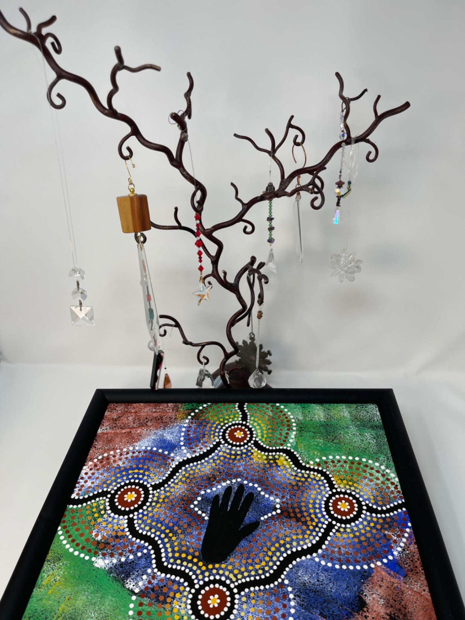A metal tree with hanging crystals the tree measures 19 inches tall and the base is 7 inches wide. Various crystals adore this tree. Also included in this lot is a painting, abstract painting of a hand and it measures 15 inches wide 13 inches tall no signature was found